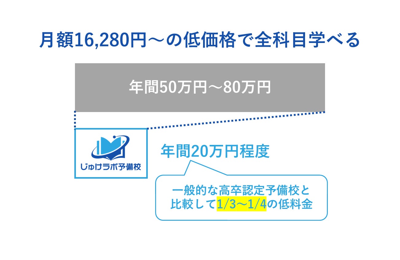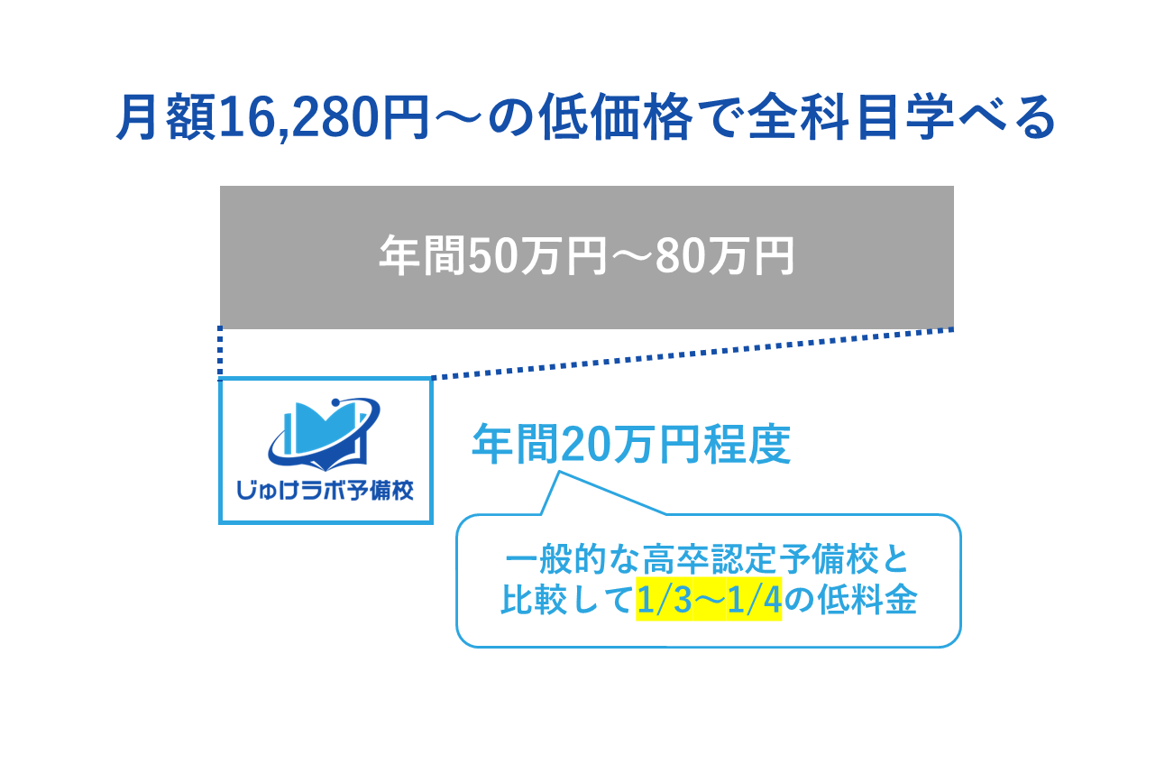 通常、高卒認定予備校の学費は入学金や受講料を合わせると、年間50万〜80万円が相場である事を考えると、じゅけラボの高卒認定対策コースは1年間受講しても20万円程度なので1/3〜1/4の安い費用で受講できるので経済的です。