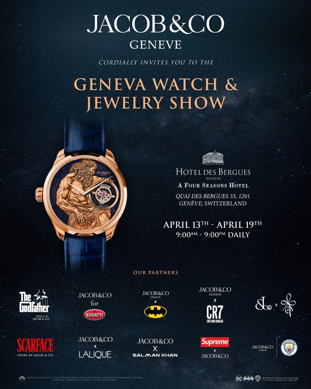 ジェイコブ&コーは、2026年4月13日(月)から4月19日(日)までの7日間、スイス・ジュネーブのフォーシーズンズホテルにて「GENEVA WATCH & JEWELRY SHOW」を開催いたします。