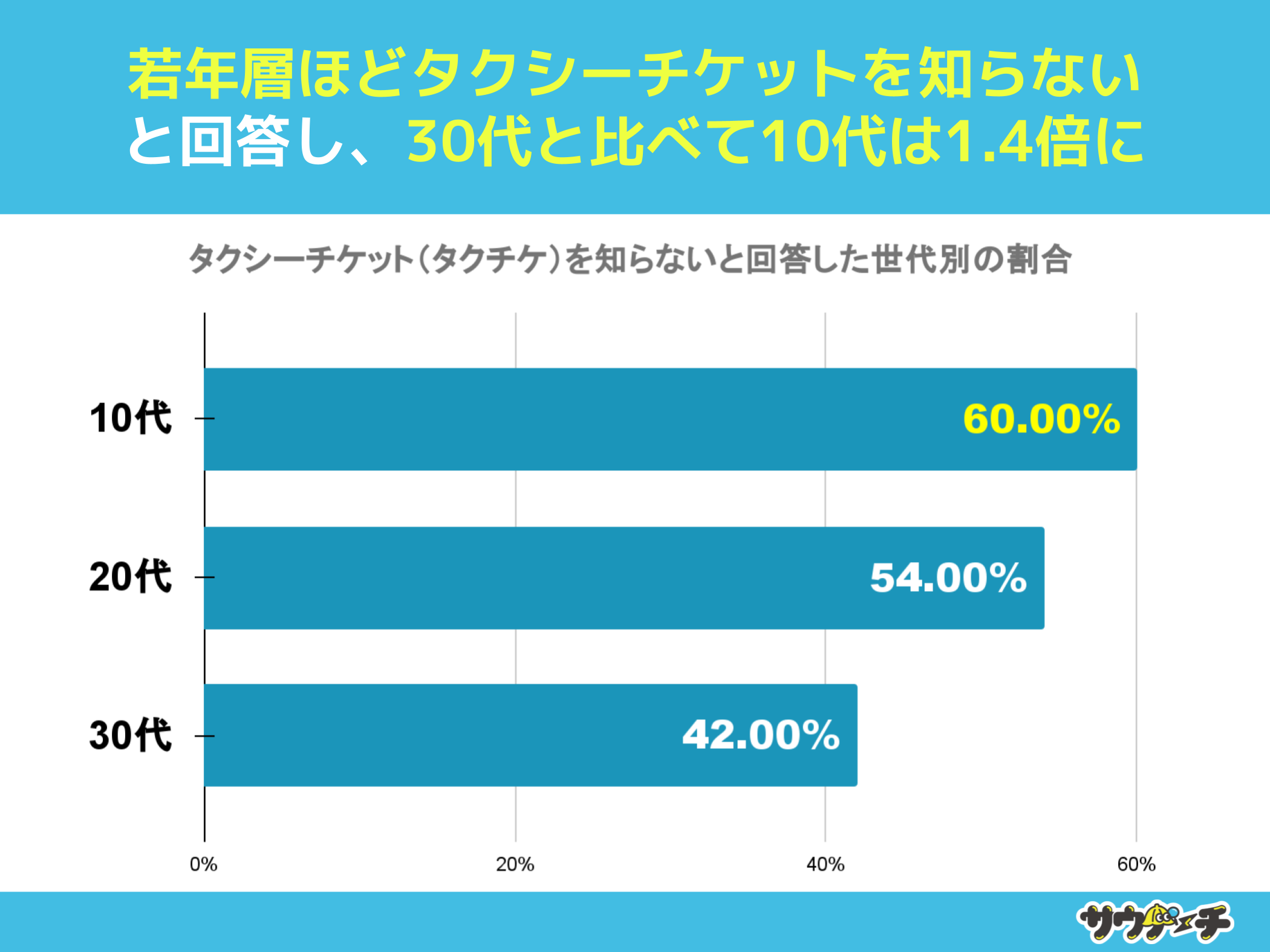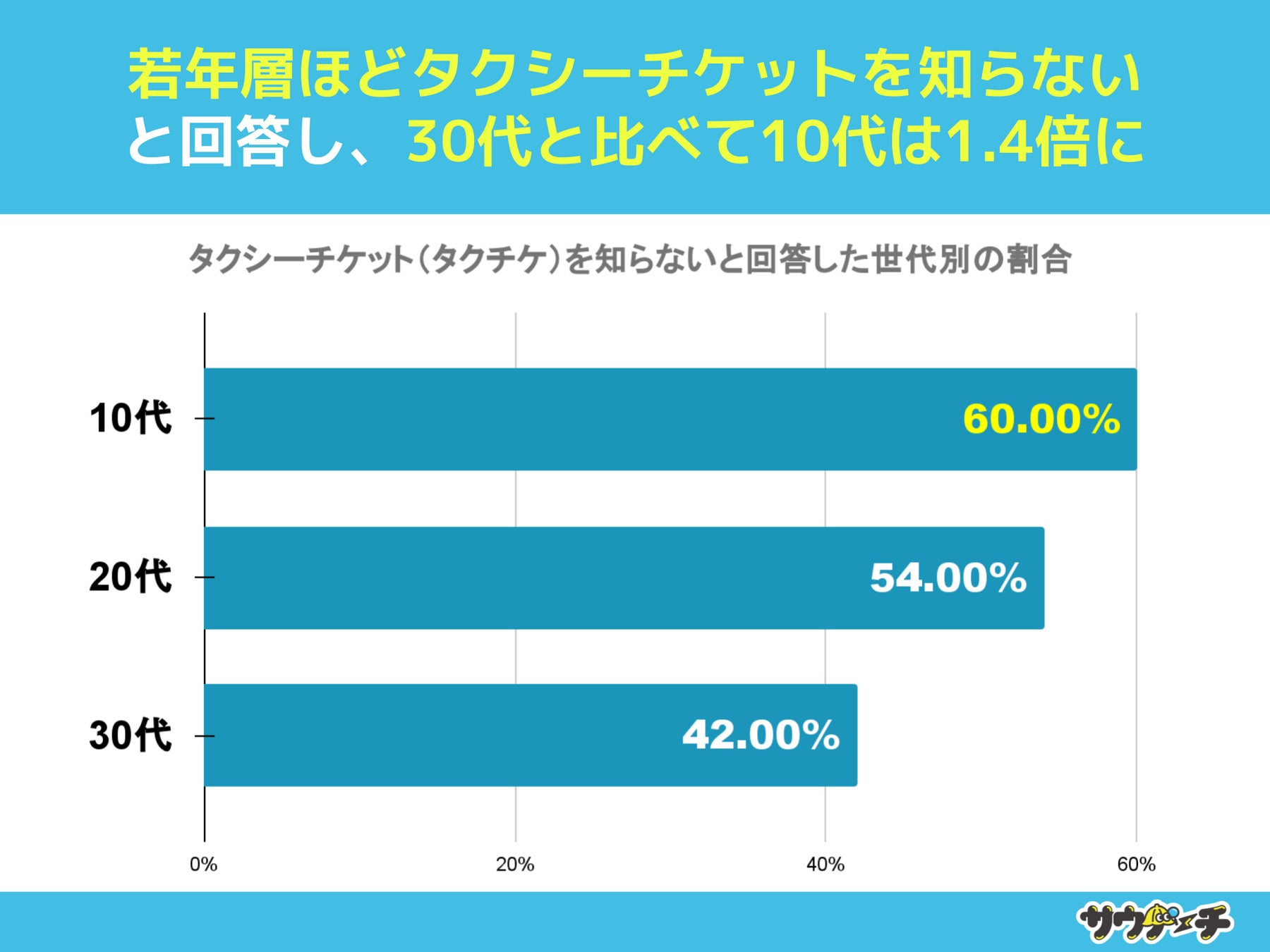 タクシーチケット(タクチケ)を知らないと回答した割合を世代別でみてみますと、10代の60%が最も高く、次いで20代の54%、30代が42%で、30代と比べて10代は1.4倍高い結果となりました。
