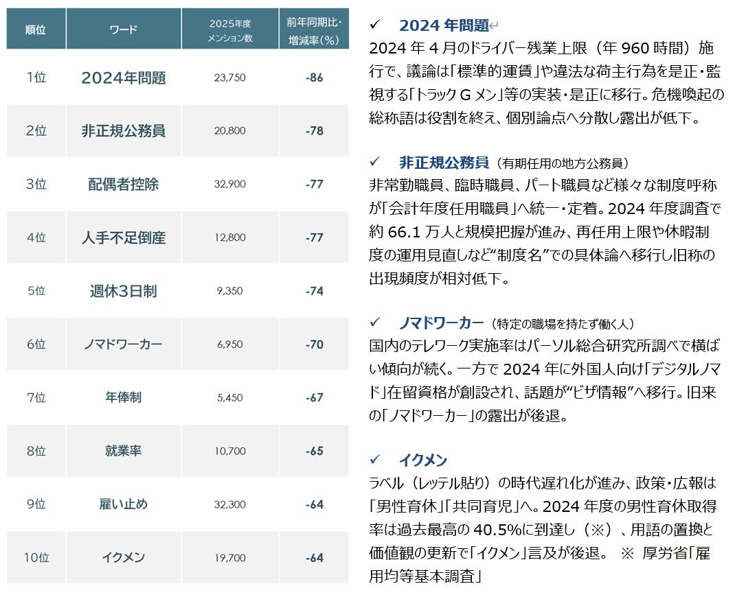 本調査では、SNS・ブログ・レビューサイト・掲示板など、国内10万のソーシャルメディアから取得した「はたらく」に関する投稿(サンプリングデータ)を定期的に分析するもので、2025年度上半期の調査では、24年度下半期に引き続き「年収の壁」への関心が高く、今回も最多の増加率を記録しました。社会保険の適用拡大にともなう制度変更に対して、戸惑いや不安、制度への疑問、期待など、さまざまな声がSNS上に広がりました。