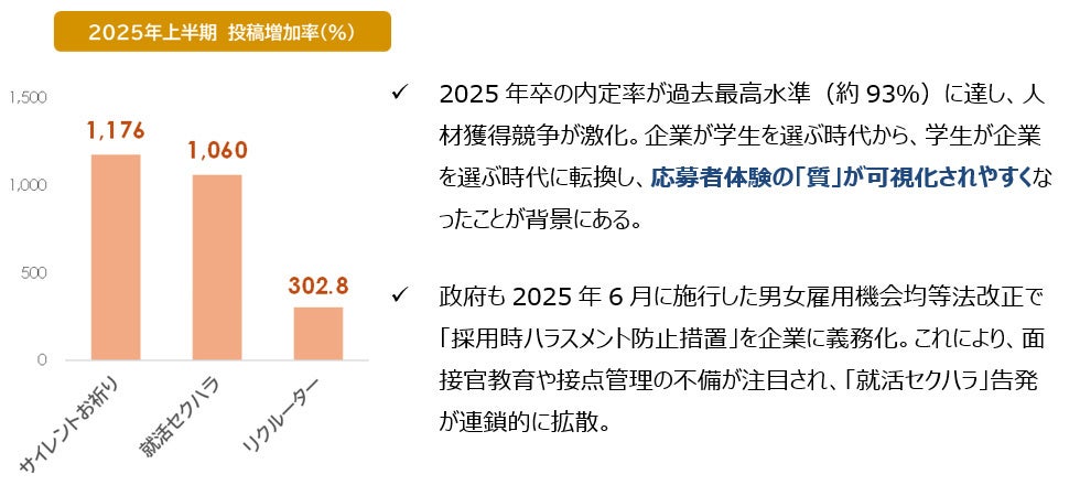 さらに、2025年卒の内定率が過去最高を記録したことを背景に、学生が企業を選ぶ売り手市場が加速。採用時の対応や面接官の言動に対する投稿が増加し、「就活セクハラ」など、企業の姿勢が問われるテーマにも関心が集まりました。