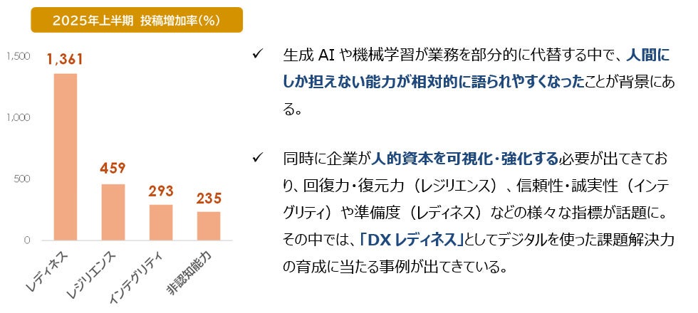 また、ランキング2位には「レディネス」が浮上。DX推進や人的資本の開示が進む中で、個人の学習や成長に対する変化対応力(準備状態)を測る指標として、注目が高まりました。