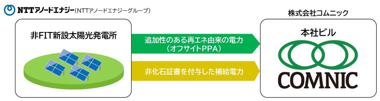 システム開発の「企画・設計」、「製造」、「導入・構築」、「運用」までを一貫して手がけている株式会社コムニック(代表取締役社長:大松 聖嗣 本社:東京都中央区 以下、コムニック)は、このたび、本社ビル(東京都中央区)において、NTTアノードエナジー株式会社(代表取締役社長:岸本 照之 本社:東京都港区 以下、NTTアノードエナジー)が新設した太陽光発電所の再生可能エネルギー(以下、再エネ)由来の電力を、オフサイト型コーポレートPPA※1(以下、オフサイトPPA)の仕組みにより導入し、2025年6月1日より利用を開始しました。