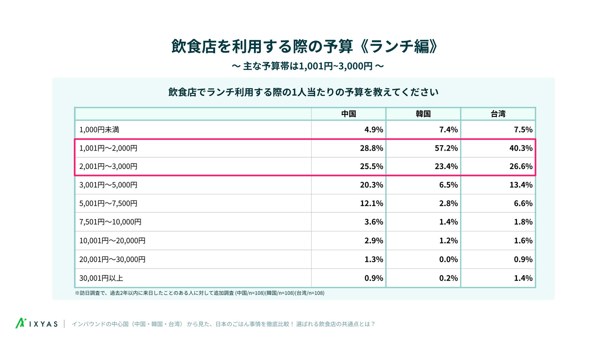 AI搭載型の店舗情報発信・分析プラットフォーム「STOREPAD(ストアパッド)」を運営するイクシアス株式会社は、中国、韓国、台湾の各国20歳以上の男女1,000人を対象に、訪日の際の飲食店選びに関する実態調査を実施しました。本調査では、ランチ・ディナー時の予算感や、飲⾷店利⽤後にレビューを投稿するきっかけ、飲⾷店を探す際に困ったことなど、インバウンド施策に活用できる最新のインサイトが明らかになりました。