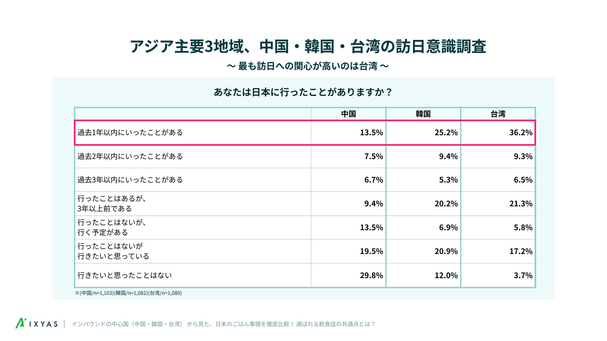 過去1年以内の訪⽇経験は、台湾(36.2%)が最も多く、次いで韓国(25.2%)、中国(13.5%)。 台湾は訪⽇経験率が最も⾼く、韓国も⽐較的⾼い。⼀⽅で、中国は他2国に⽐べて低いことがわかった。