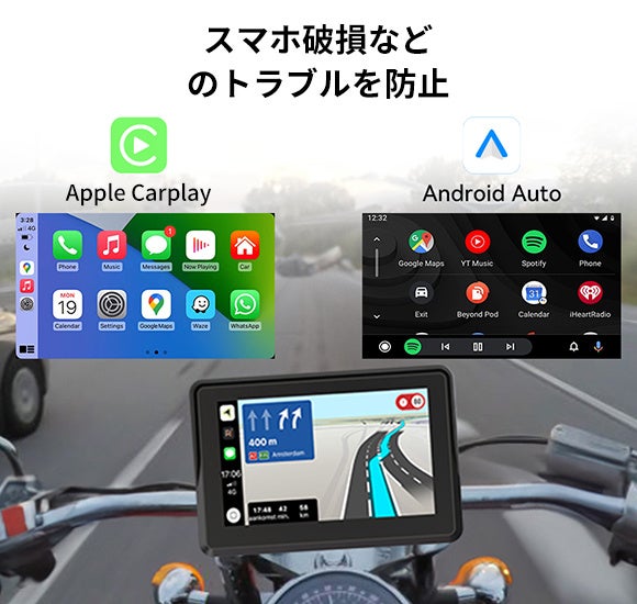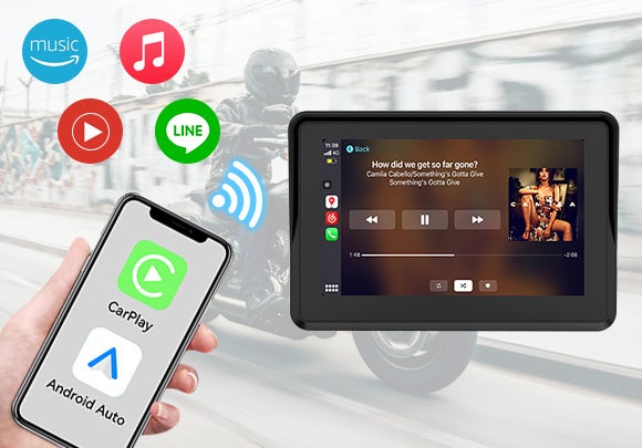 本製品はApple CarplayとAndroid Autoに対応しているので、スマホの機能を便利に活用することができます。本機と接続すれば、スマホをポケットに入れたまま最新の曲をバイクでもお楽しみいただけます。