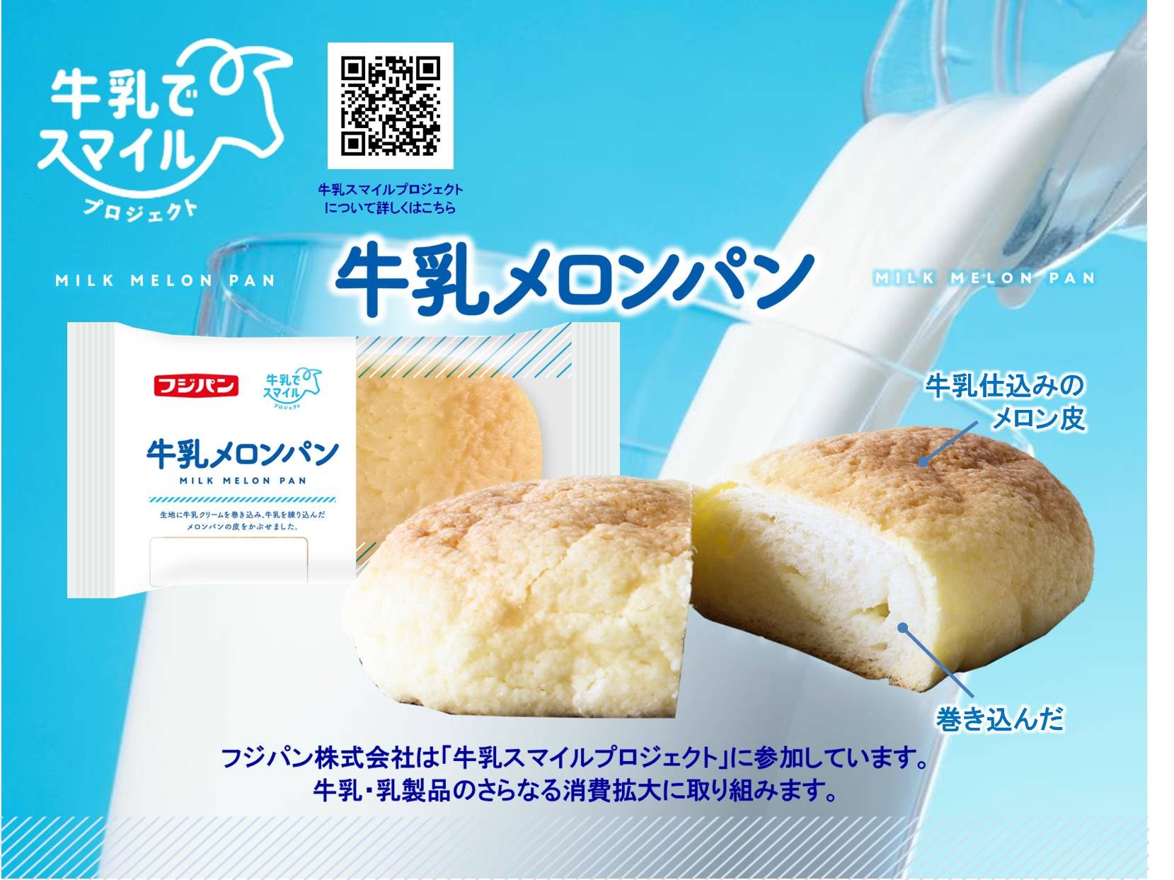 『牛乳メロンパン』は、生地に牛乳フィリングを巻き込み、メロン皮にも牛乳を練り込んであるのでどこを食べても牛乳の味が口いっぱいに広がる設計となっております。マイルドな味わいと風味にこだわりました。また、『牛乳でスマイルプロジェクト』に参加し、パッケージに共通ロゴを使用、日本の酪農関係者を応援し、牛乳・乳製品の消費拡大の一助となるように取り組んでいます。