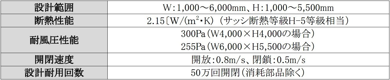 この度、お客様のニーズに、より広くお応えするために、大きな開口を必要とする工場や倉庫、カーディーラーといった設置場所の特性を考慮し、高速高頻度性能と断熱性能はそのままに、これまで最大W4,000mm×H4,000mmの設計範囲を、W6,000mm×H5,500mmまで拡大し、より多くのお客様の環境課題をサポートできるようになりました。