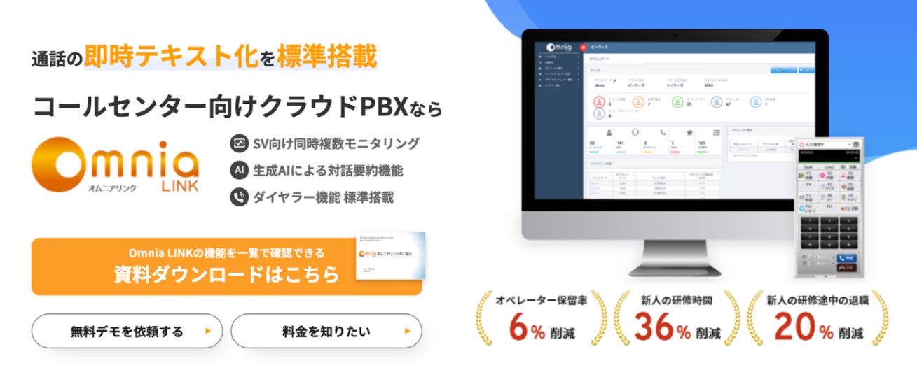 Omnia LINK(オムニアリンク)とは、音声認識を標準搭載し、クラウドコールセンターシステム(クラウドPBX※)における様々な課題を解決できるシステムです。音声認識を標準搭載し、クラウドコールセンターシステム(クラウドPBX)に必要な機能をオールインワンでご利用いただけます。