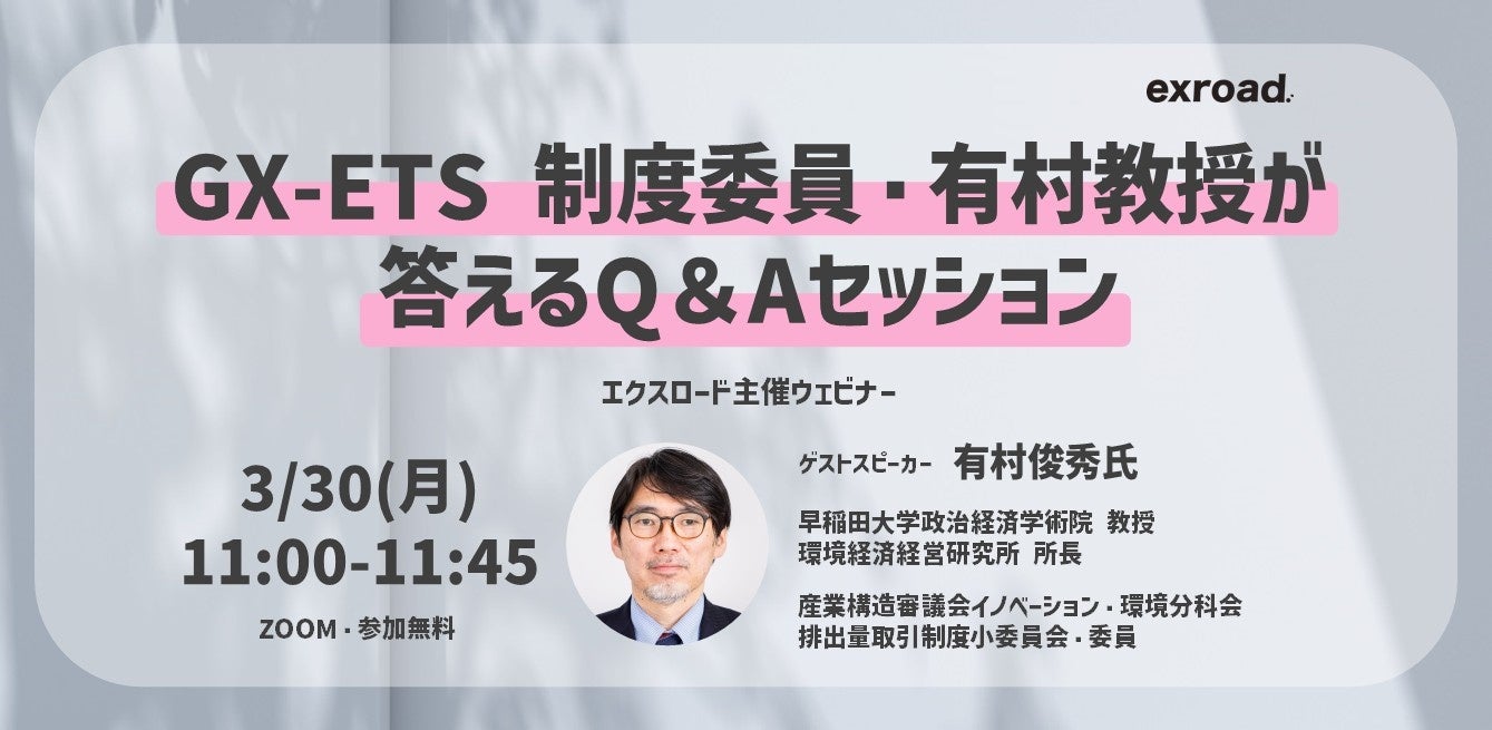 カーボンクレジット・排出量取引制度オールインワンデータベースを提供する株式会社exroad(エクスロード、本社:東京都港区、代表取締役:木村圭佑)は、「【GX-ETS】制度委員・有村教授が答えるQ&Aセッション」と題し、3月30日(月)11:00‐より無料ウェビナーを開催いたします。