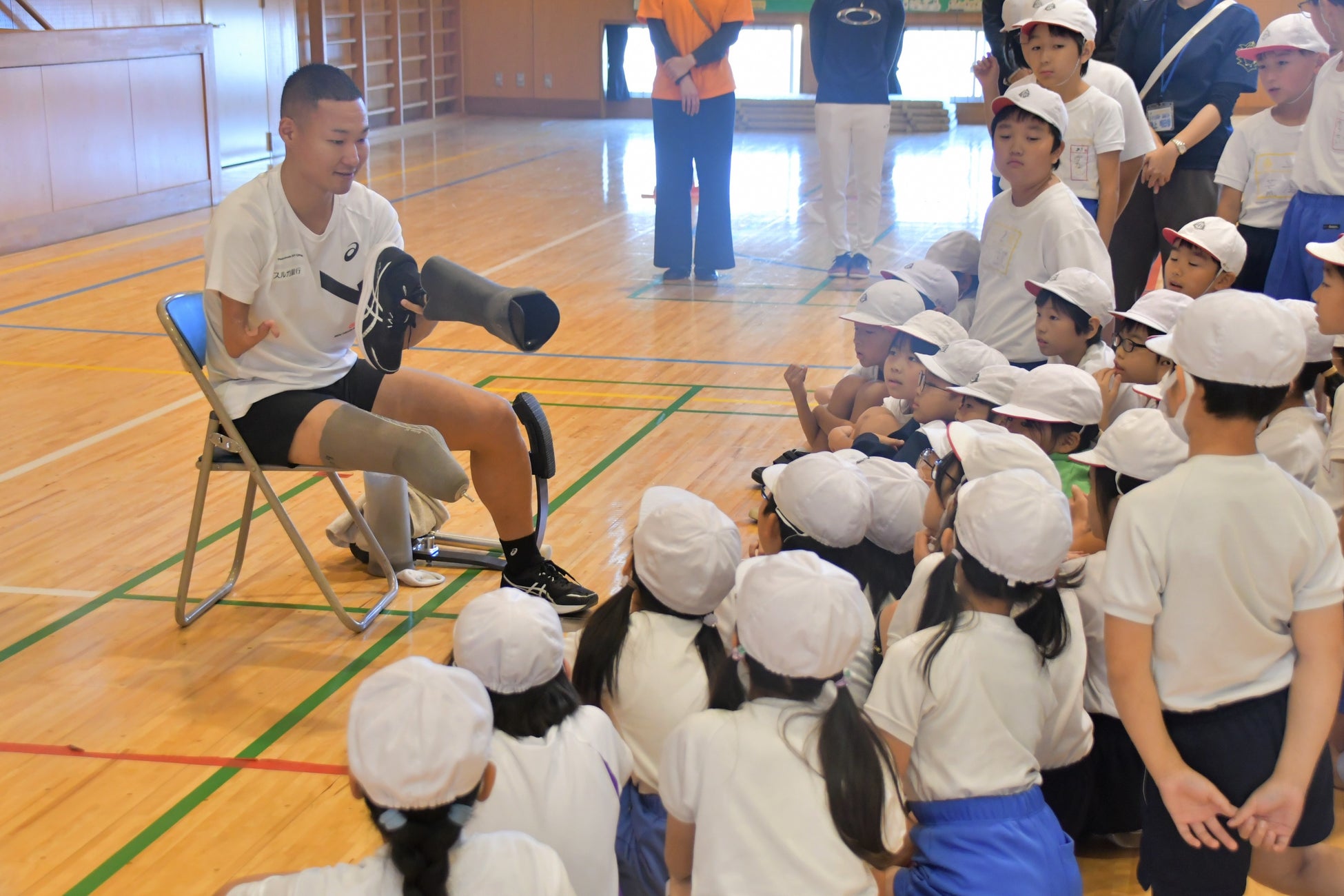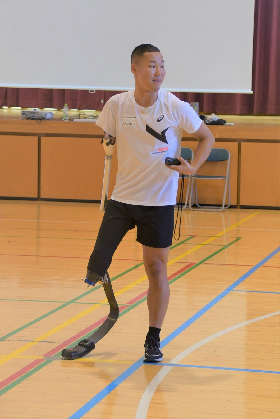 講話では、先天性で生まれたときから右膝下と右腕の肘から先に障がいを抱えていることや、ご自身の経験や生活について、子どもたちの素朴な疑問に答えていました。