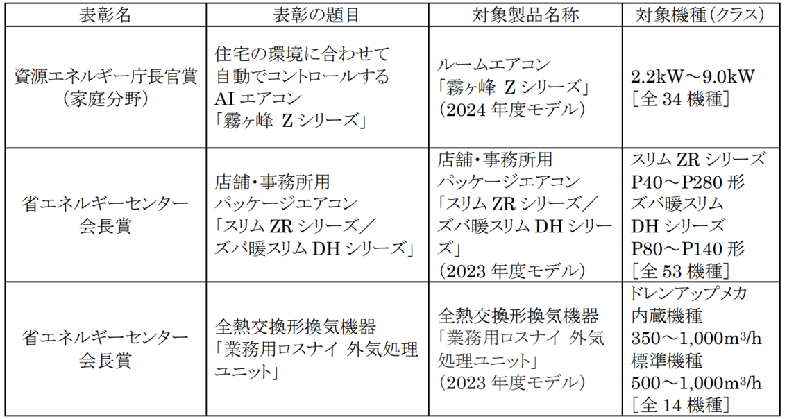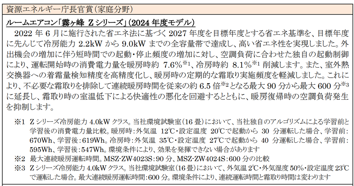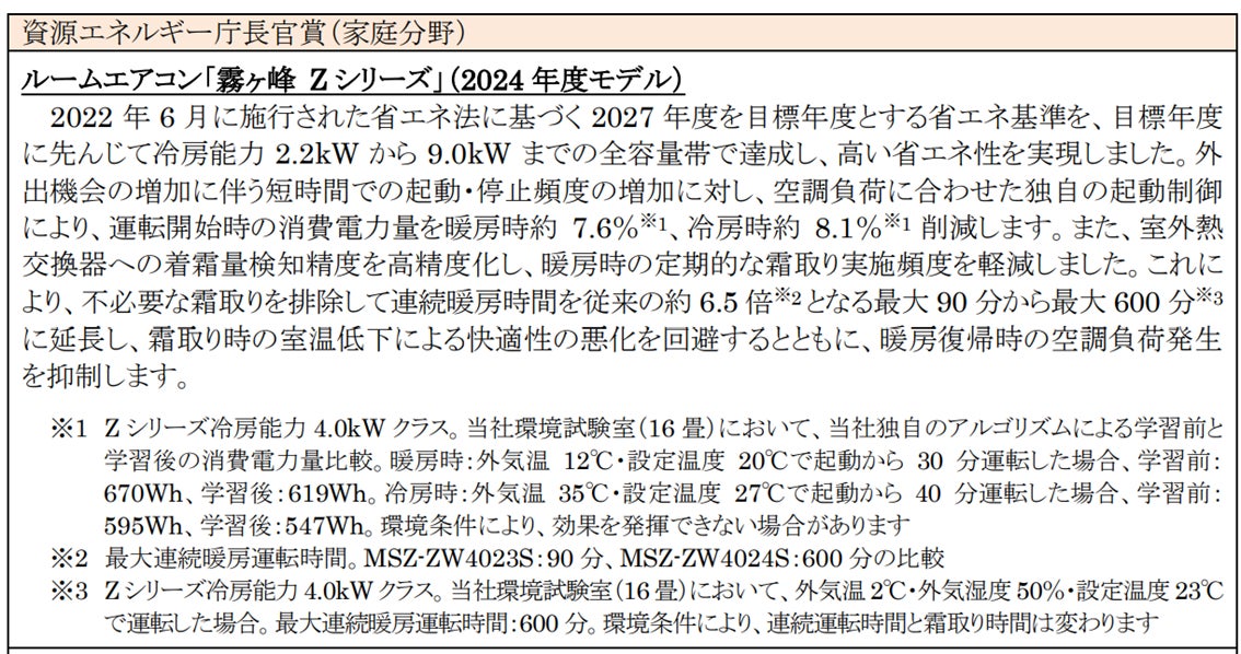 ルームエアコン「霧ヶ峰 Zシリーズ」で「資源エネルギー庁長官賞」など