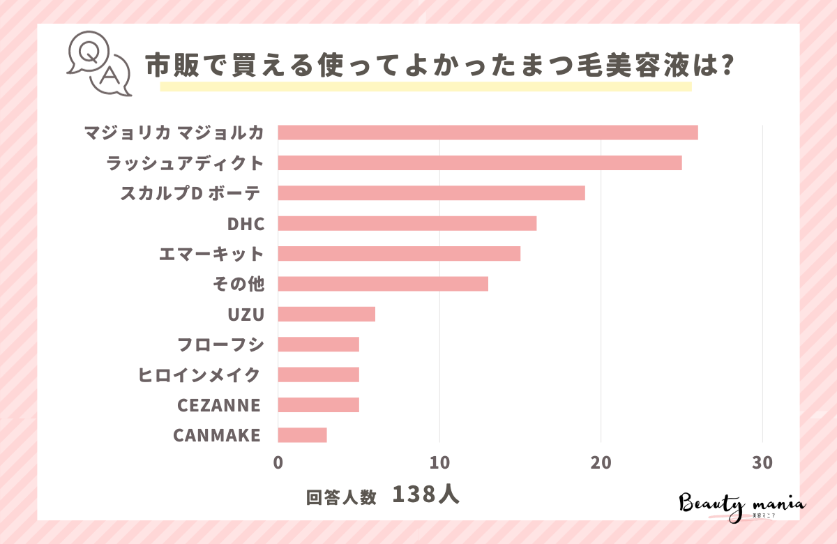 「市販で買える使ってよかったまつ毛美容液おすすめはなんですか」とアンケート調査した結果、1位は『マジョリカ マジョルカ | ラッシュジェリードロップ EX(25人)』2位は『ラッシュアディクト | アイラッシュコンディショニングセラム(26人)』、3位は『スカルプD ボーテ | ピュアフリーアイラッシュセラム プレミアム(19人)』となっています。