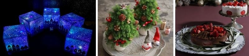 前半は、「花のささやき」による空間演出に嬉しいLEDキャンドルや、ドライフラワーやプリザーブドフラワーなどの作品を手がける「Deuxieme(ドゥズィエム)」のクリスマスアイテムなどを販売。後半では、スイーツの出店もあり、raw&vegan sweets専門店「Maple Raw」のケーキなども販売します。