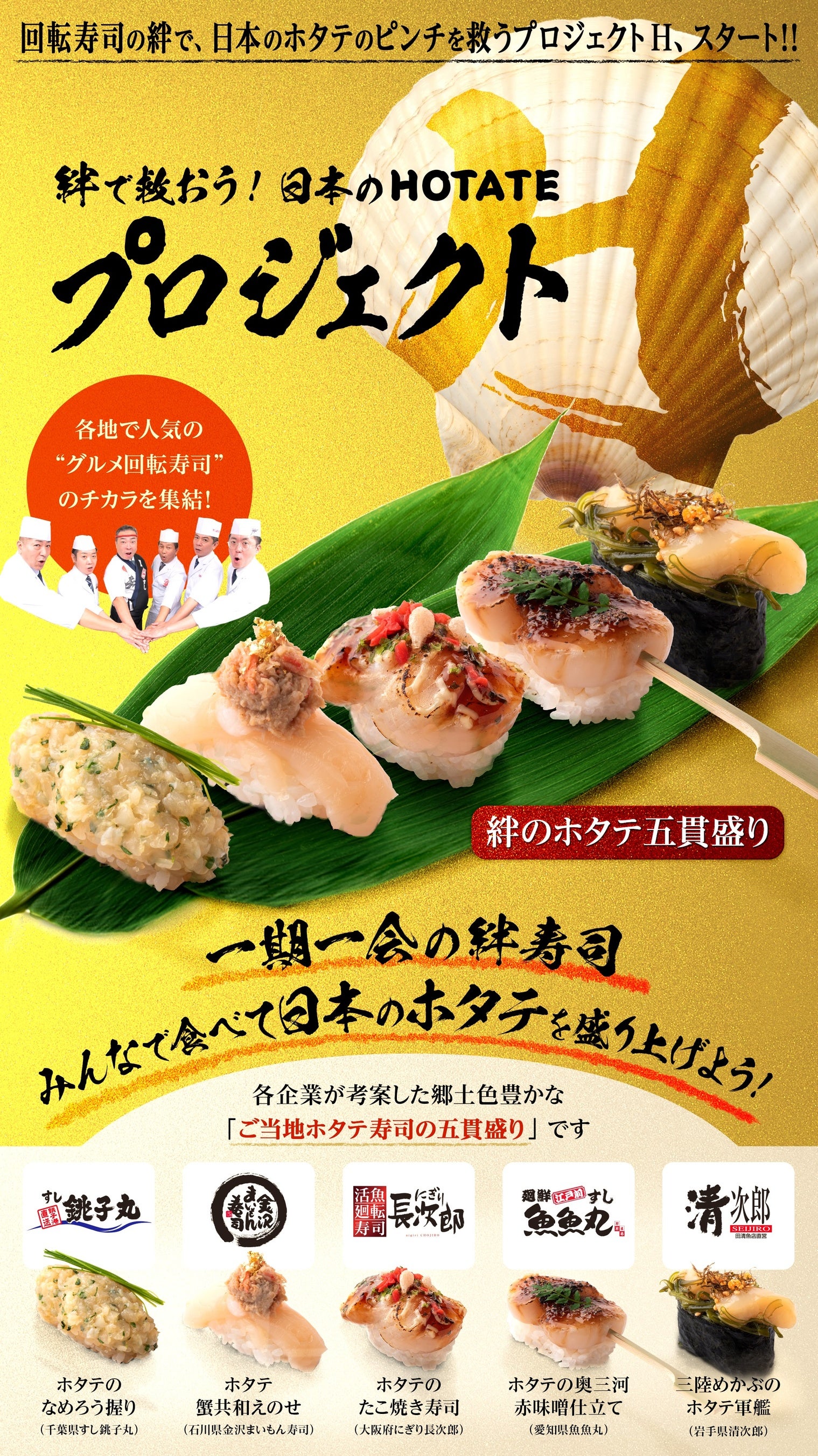 【にぎり長次郎】グルメ回転寿司6社が結集!『プロジェクトH (HOTATE) 〜絆で救おう!日本のホタテ〜』11/6より開催