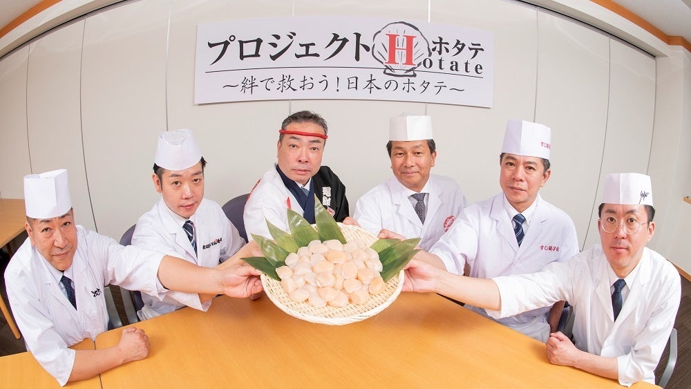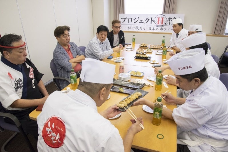 この現状に危機感を募らせた全国各地のグルメ回転寿司店は、問題解決のために業界では初の試みとなる競合6社(5グループ)による共同プロジェクト「プロジェクトH(HOTATE)〜絆で救おう!⽇本のホタテ」を⽴ち上げることにしました。ホタテ⽣産者と回転寿司企業との絆、回転寿司企業同⼠が⼿に⼿を取り合った絆、回転寿司店とお客様の絆、ホタテ⽣産者とホタテを応援するお客様との絆。あらゆる絆によって危機を乗り越えることを⽬的にプロジェクトを発⾜いたしました。