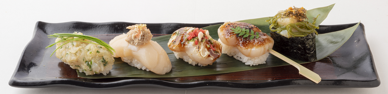 左から、ホタテのなめろうにぎり(千葉県すし銚子丸)、ホタテ蟹共和えのせ(石川県 金沢まいもん寿司)、ホタテのたこ焼き寿司(大阪府 にぎり長次郎)、ホタテの奥三河八丁味噌仕立て(愛知県 魚魚丸)、三陸めかぶのホタテ軍艦(岩手県 清次郎)