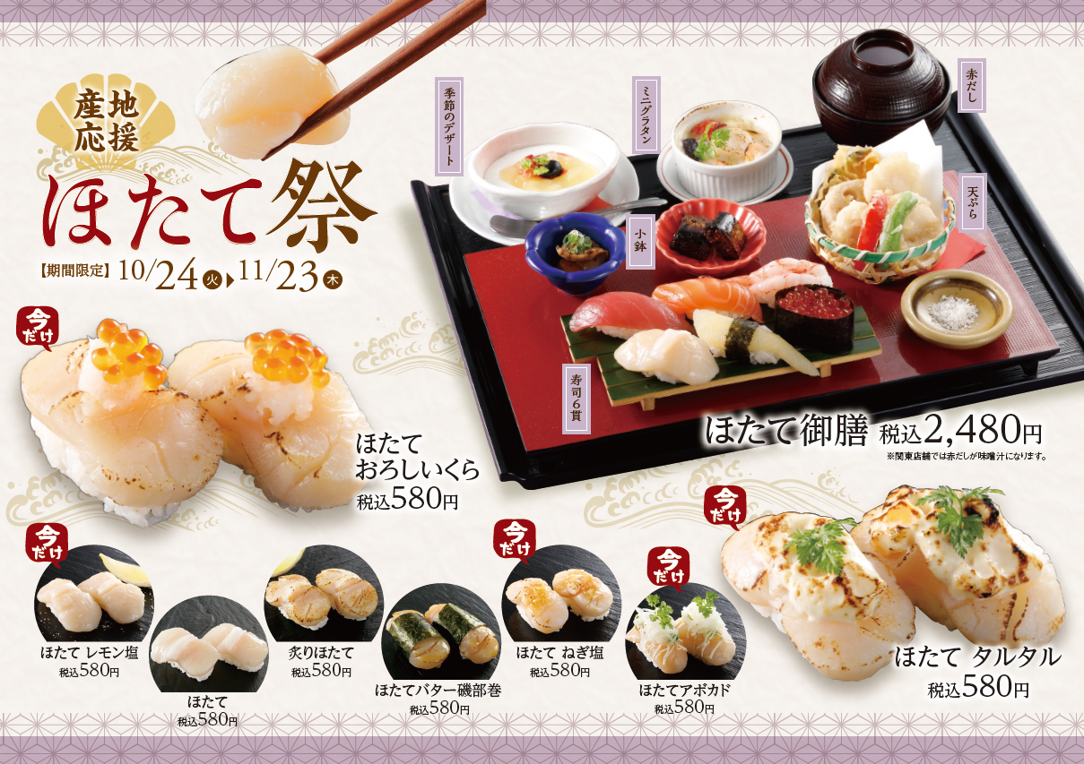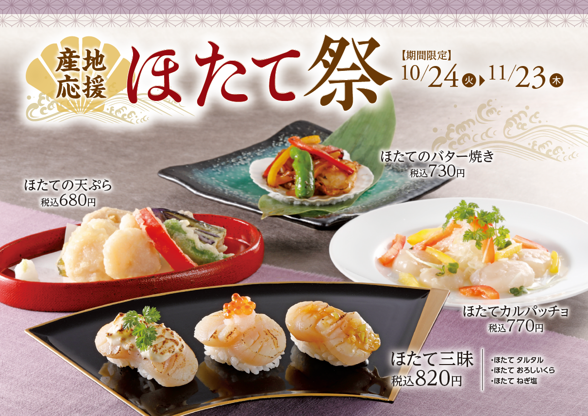 現在、にぎり長次郎で先行開催中の「産地応援~ほたて祭~」に加え、今回の共同キャンペーン実施でさらに日本のホタテ消費を盛り上げ、産地を応援してまいります。この機会にぜひご賞味ください。