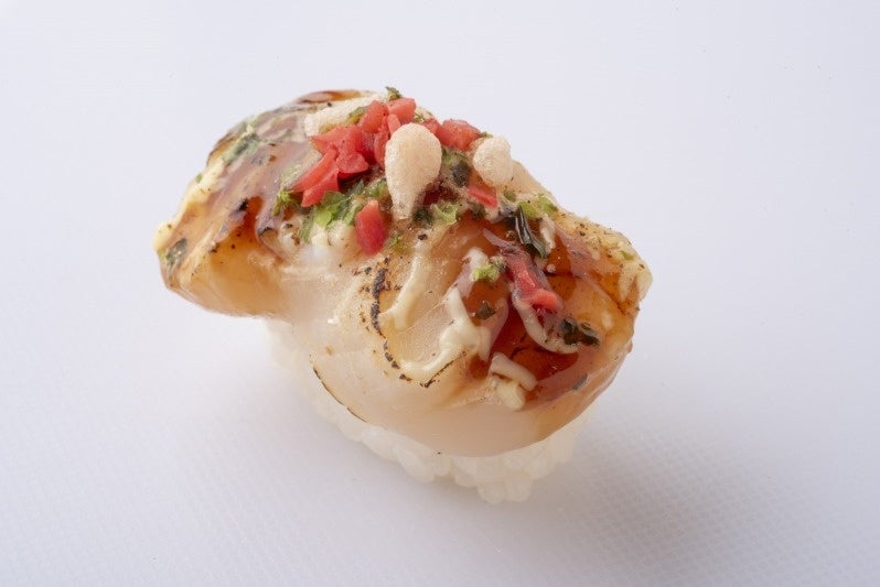 炙ったホタテにソースとマヨネーズを掛け、紅しょうが、揚げ⽟、⻘のりをトッピング。ふんわりホタテがたこ焼きに感じられる摩訶不思議な寿司です。大人でもお子様でもパクパク召し上がれる間違いない味です!