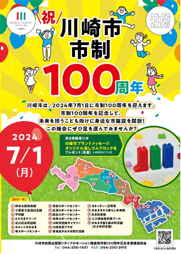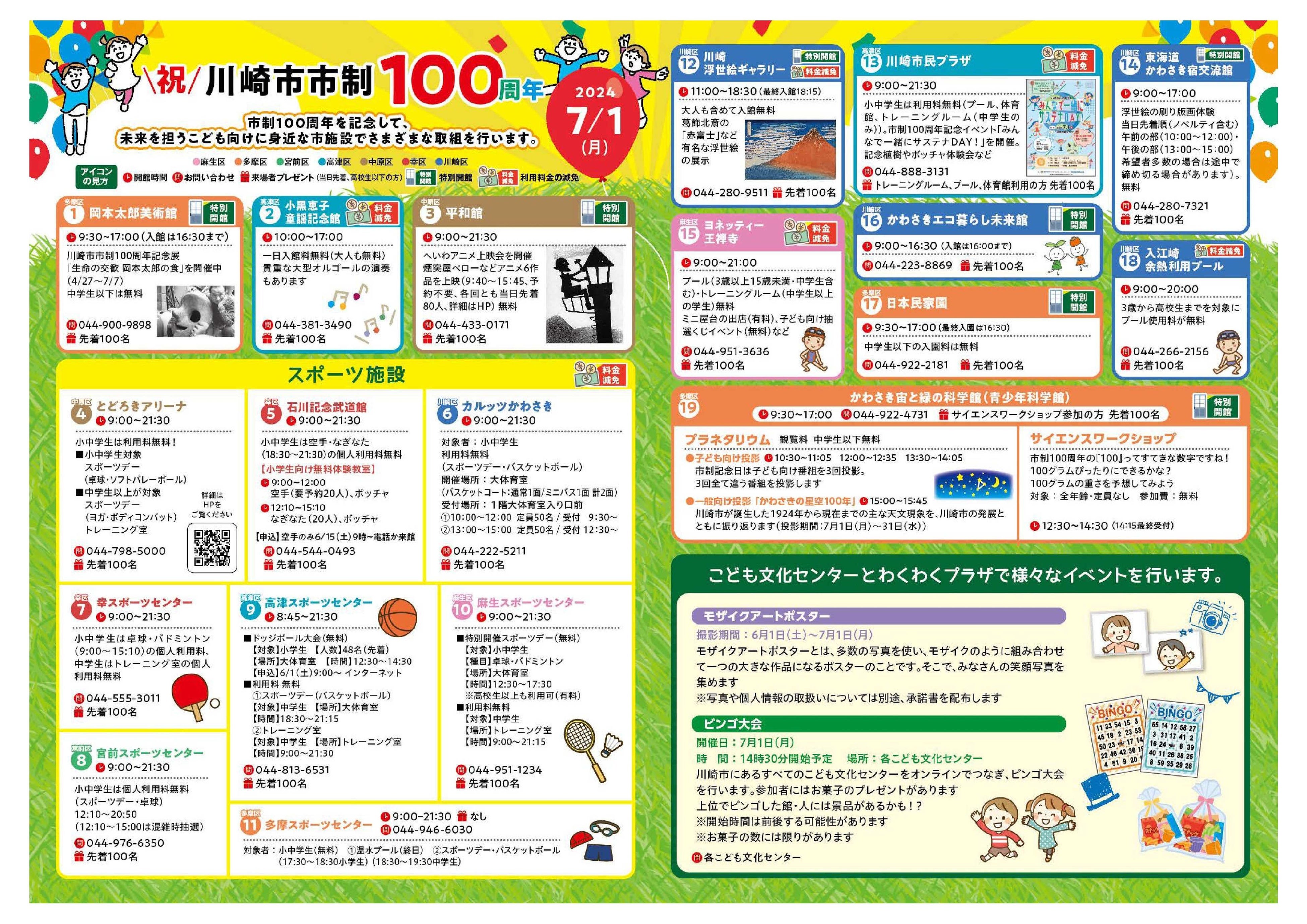 【川崎市市制 100 周年記念事業】市制記念日の7月1日にスポーツ施設や美術館などの市施設を開放します