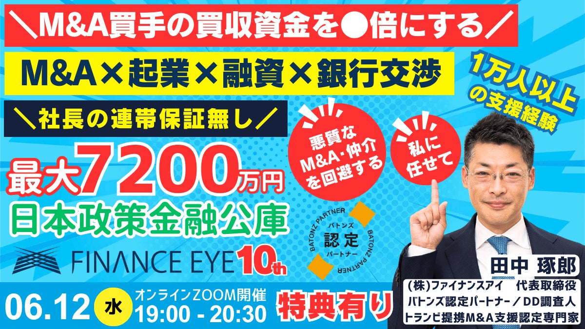 株式会社ファイナンスアイ(所在地:大阪市、代表:田中琢郎)は、M&Aの買手向けに買収資金を増やしたいM&A起業やM&A買収を考える起業家・個人事業主・中小企業の経営者に向けて特別なセミナーを開催致します。『M&A×融資で買手の買収資金を自己資金×●●倍にする!M&A×起業×融資×銀行交渉の今スグ使える実戦ノウハウ。社長の連帯保証無し!無担保で最大7200万円!日本政策金融公庫の新規開業資金(創業融資)を活用する。』(※参加者の顔出しナシ)と題したこのセミナーでは、日本国内M&A成約数1位のBATONZ(バトンズ)認定パートナーの田中琢郎社長自らが、1万人以上の起業家や経営者を支援した実戦経験をもとに、M&A起業やM&A買収資金にも使える、新規開業資金(創業融資)を成功させるポイント、M&Aを成功させるための案件選定基準を分かりやすくお伝えします。本セミナーは、2024年6月12日(水)19:00より、オンラインでZOOMを使用して実施されます。コロナ禍を乗り越え、億超えの起業家を生み出し続けたファイナンスアイが、良い案件も悪い案件も1万人以上をリアルに支援したから分かる融資審査の本音と建前、M&Aのオカネとリスクの解決策を分かりやすく伝えます。セミナーでは田中社長とライブで質疑応答ができるので厳格化する融資審査を乗り越えるために具体的なアドバイスが欲しい人はチャンスです。セミナー申込時の受付フォームで事前質問に記入してもらえれば、セミナー中に回答できそうにない内容でも別途具体的なアドバイスを受けられます。この機会に誰にも相談できなかった悩みや疑問を解決しましょう。このセミナーを受講すれば、あなたのビジネスもファイナンスの力を活用して成功の軌道に乗ることができるでしょう。会社の未来のオカネをクリエイティブする事がファイナンスです。