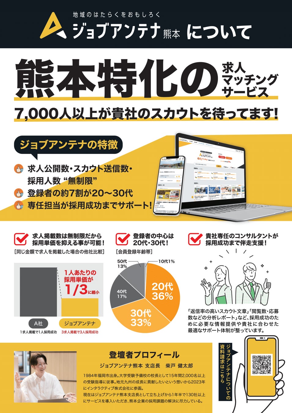 第二部では、ジョブアンテナ熊本支店長の柴戸健太郎氏が登壇し、「だごいいかも!で企業とマッチング ~熊本特化の求人マッチングサービス~」をテーマに講演いたします。