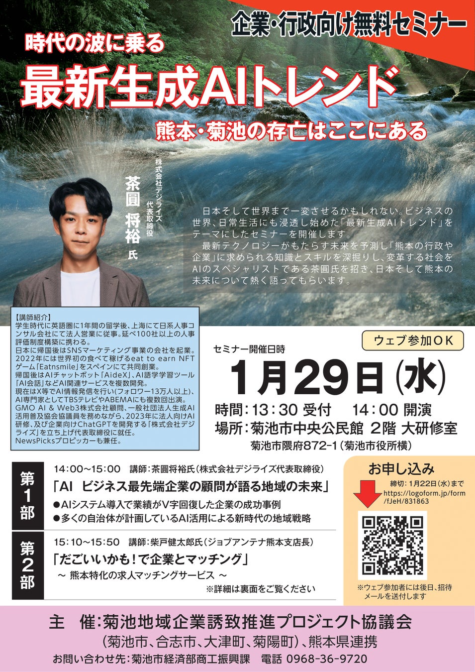 株式会社デジライズ(本社:東京都港区、代表取締役:茶圓将裕)は、熊本県菊池市にて、自治体・企業向けAIデジタル変革推進セミナーを開催することをお知らせいたします。