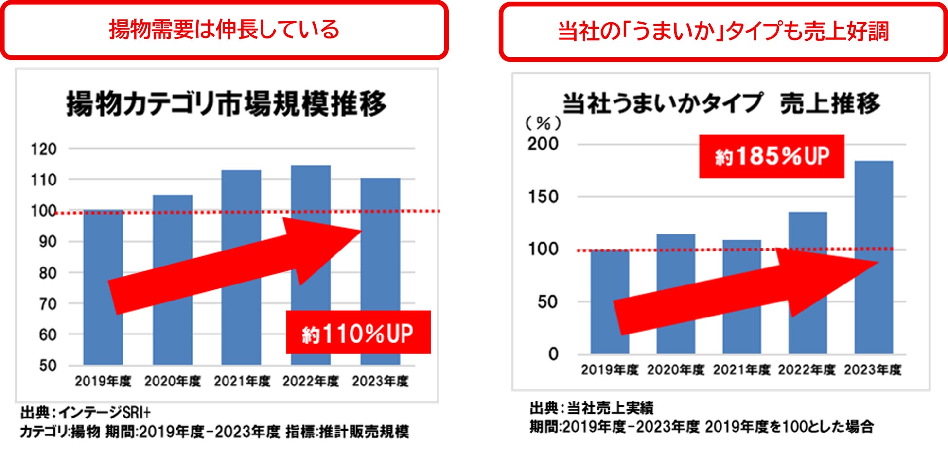近年、珍味カテゴリの中では揚物商品の市場が伸長しています。ボリューム感や噛み応え、しっかりとした食べ応えによる満足度が高いことが理由として考えられ、当社の「うまいか」シリーズも好調に推移しています。