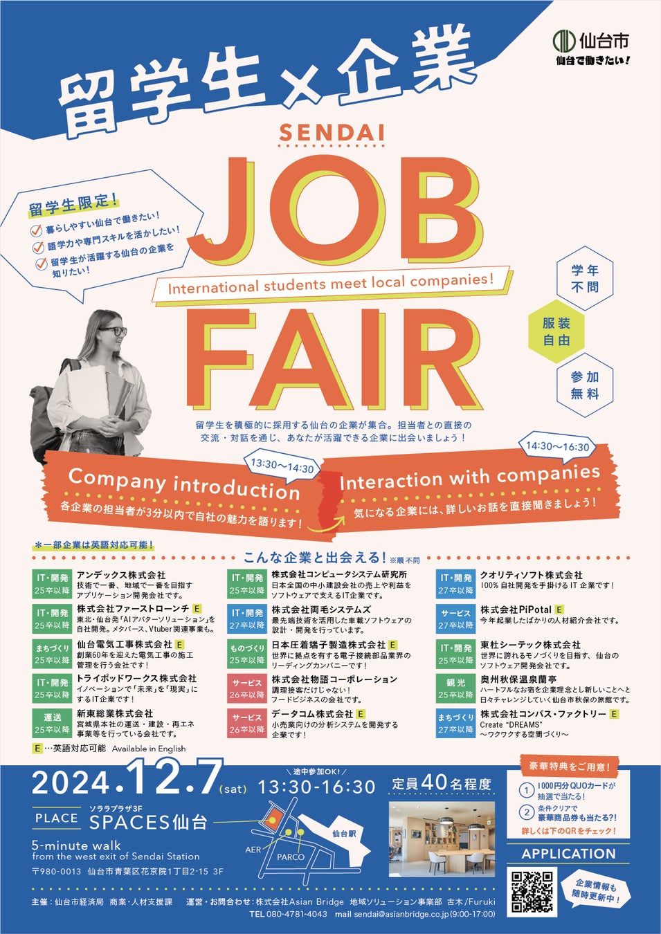 仙台市(運営:株式会社Asian Bridge)は、留学生が就職後も引き続き仙台で活躍できる魅力的な企業に出会えるキャリアマッチングイベントを12月7日に初めて実施します。