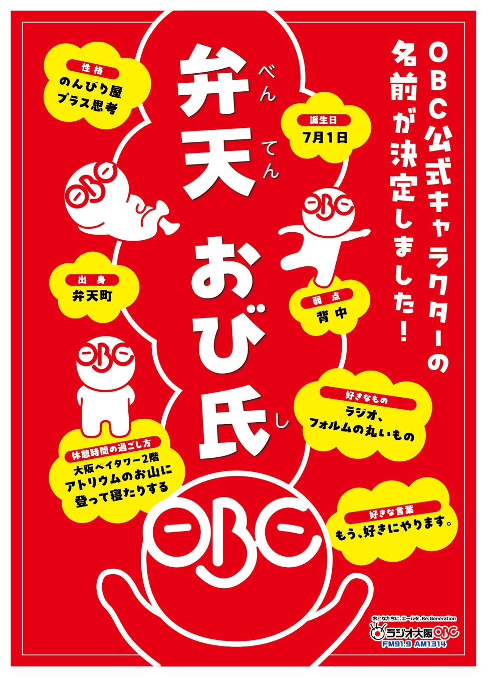 《ラジオ大阪》公式キャラクター・名前公募の結果、「弁天 おび氏」(読み方:べんてん おびし)に決定いたしました。