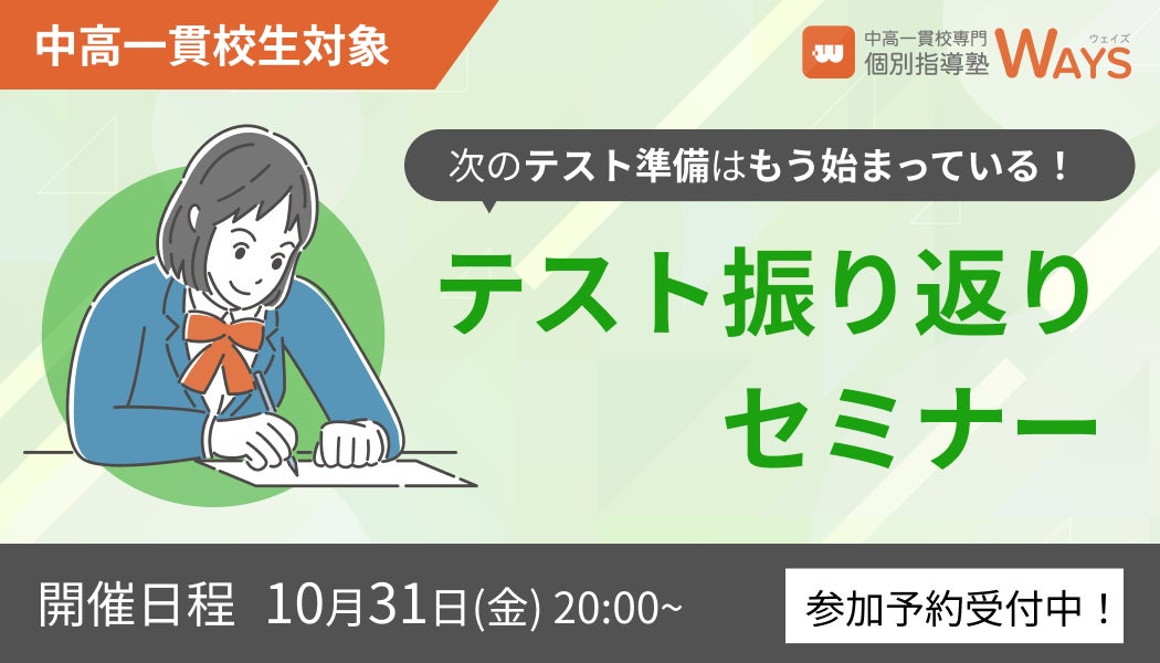 中高一貫校専門の個別指導塾WAYS(運営:株式会社メイツ、本社:東京都新宿区)は、中高一貫校に通う生徒と保護者を対象とした無料オンラインセミナー『定期テスト振り返り法 徹底解説セミナー』を2025年10月31日(金)20:00より開催します。