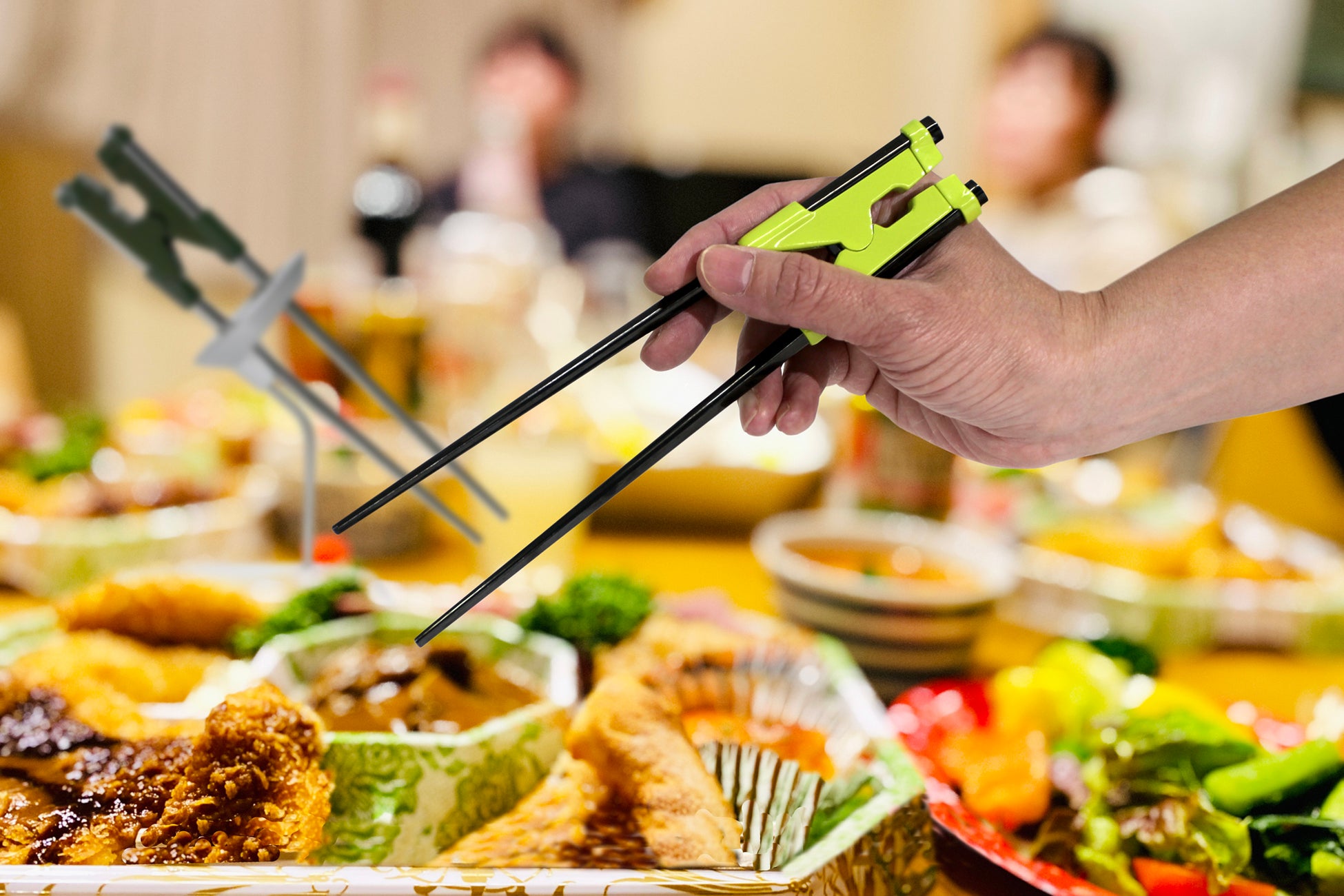 右利きの方が左手で箸を持ってご飯を食べる、というのは至難の業ですが、私たちの「Hashi-Tong CHOPPP!!」なら、利き手とは逆の手でも簡単に物をつかむことができます。