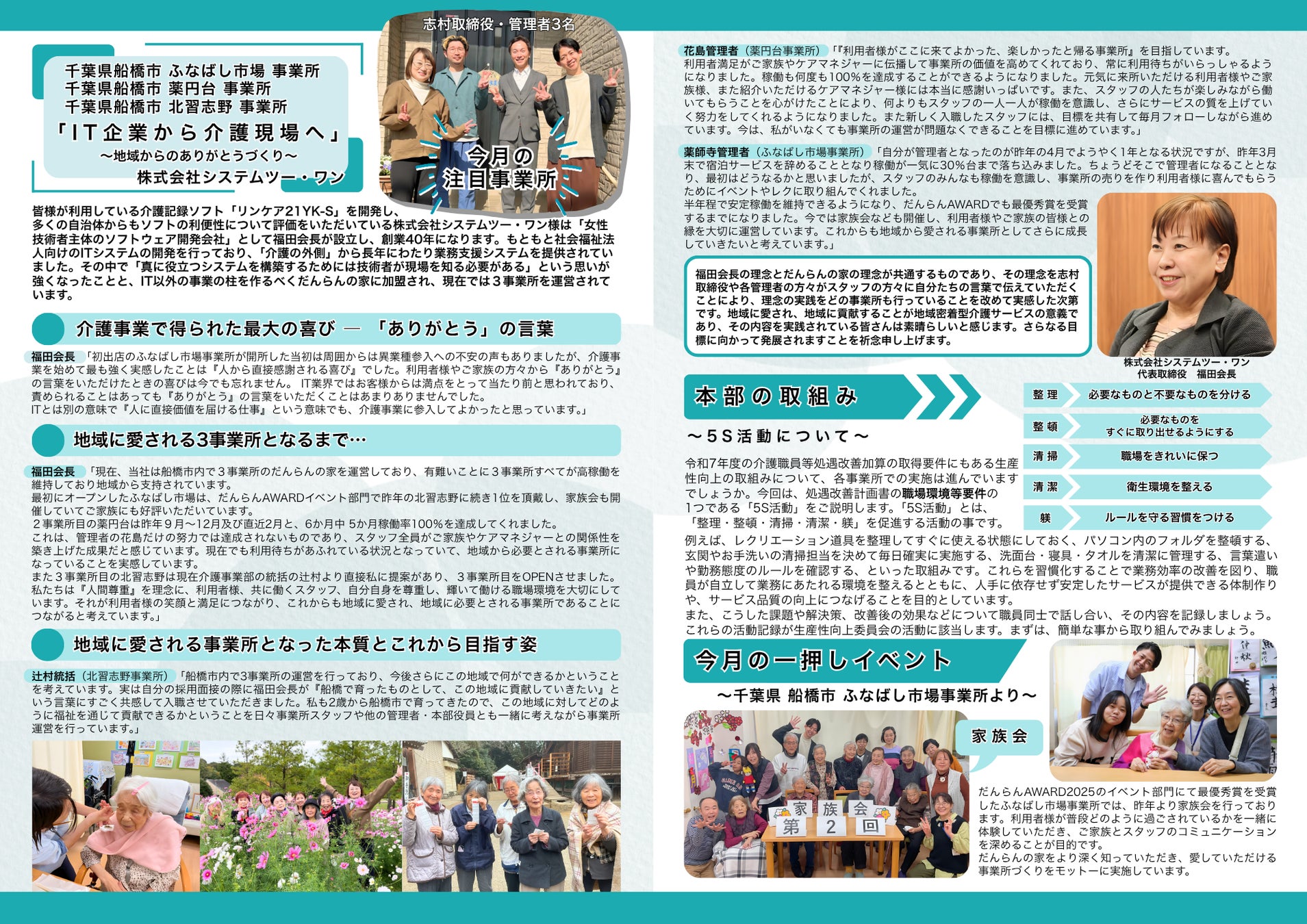 今号の特集では、千葉県船橋市で「だんらんの家」3事業所を運営する株式会社システムツー・ワンにフォーカス。もともとは介護記録ソフトの開発で長年、福祉を外側から支えてきたIT企業が、なぜ介護の現場へと踏み出したのか。そして、なぜ今、地域から深く信頼される事業所へと成長しているのか――。そこにあったのは、数字や仕組みだけでは語れない、「ありがとう」の力でした。
