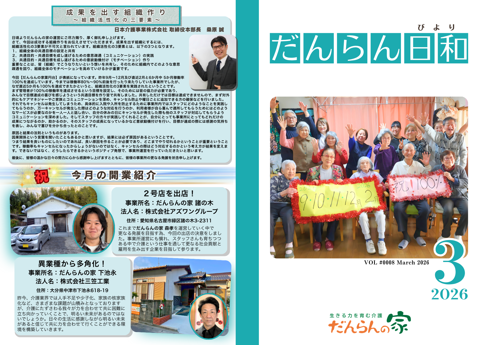『だんらん日和』は、全国の「だんらんの家」で生まれる実践や挑戦、現場で働く人々の想い、そして地域とのつながりを、毎月丁寧に掘り起こし、広く発信する広報誌です。今回の3月号は、介護が単なるサービス提供ではなく、人と人との関係の中で育まれ「ありがとう」の仕事であることを、改めて教えてくれます。