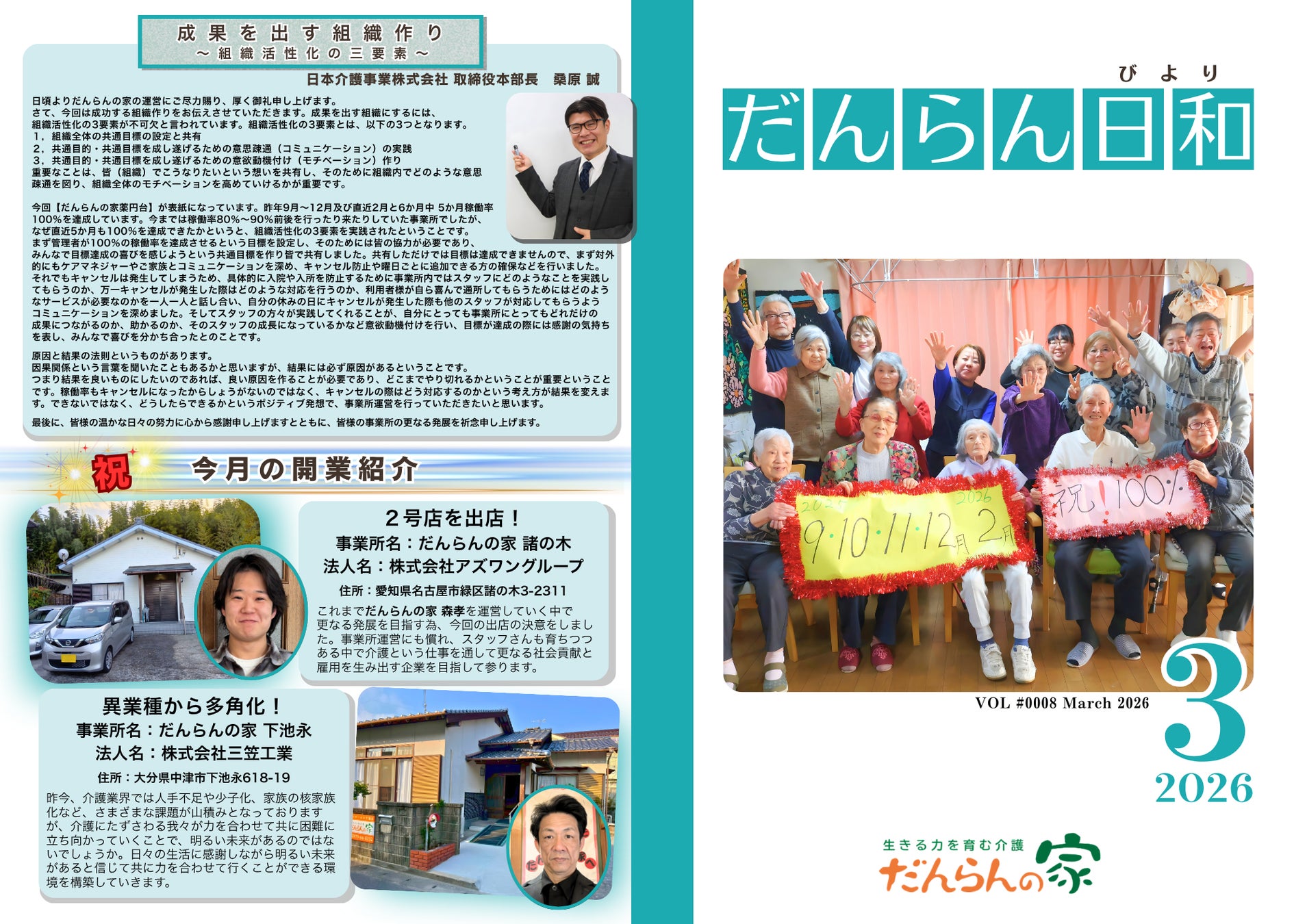 日本介護事業株式会社(本社:東京都墨田区/以下、日本介護事業)は、フランチャイズブランド「だんらんの家」の広報誌『だんらん日和』3月号を発刊しました。