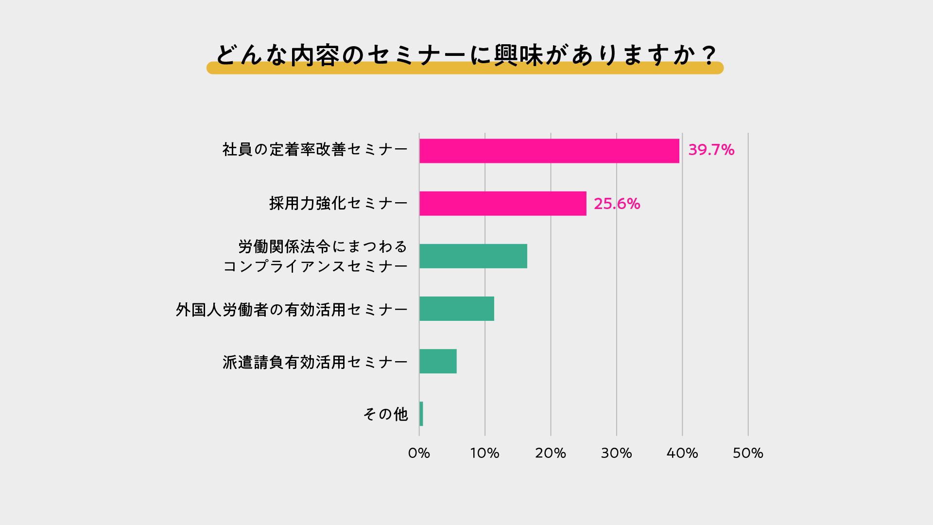 今後取り上げてほしい内容を尋ねたところ、「社員の定着率改善(39.7%)」が、「採用力強化(25.6%)」を大きく上回りトップとなりました。人材獲得競争が激化する中、新たな人材を採ること以上に「いまいる人材の流出を防ぐ」ことが、企業の最重要アジェンダとなっている実態がうかがえます。