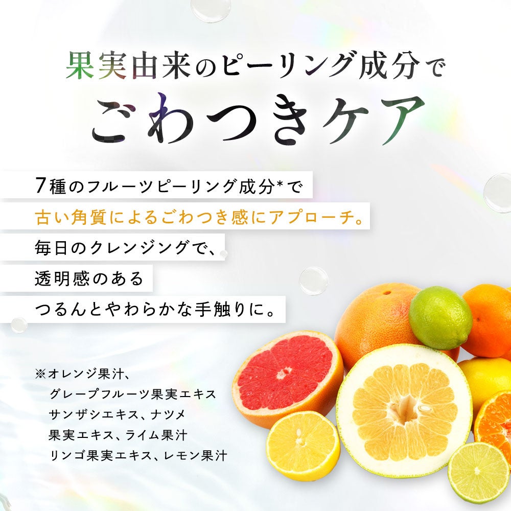 7種のフルーツ果汁によるフルリペアピール7※で古い角質によるごわつき感にアプローチし、つるんとしたなめらかな肌へ導きます。透明感のあるつややかな洗いあがりに。