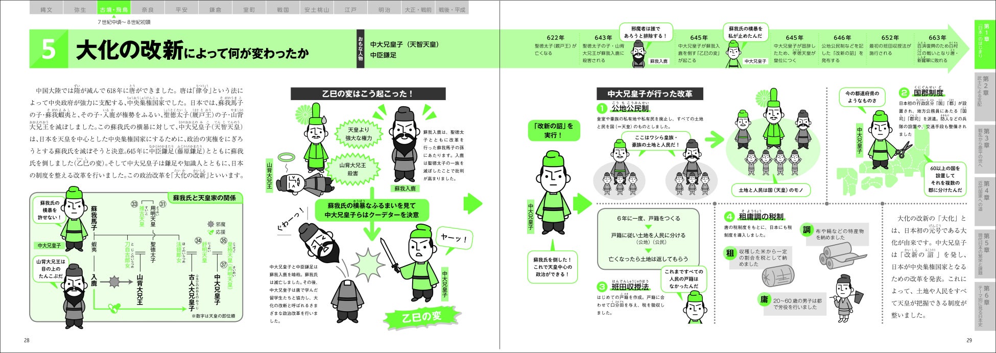 B5判の横長ワイド判、イラストを中心に展開した日本史の図鑑です。大人の学び直しとして、また中高生の日本史の学習に最適な一冊です。