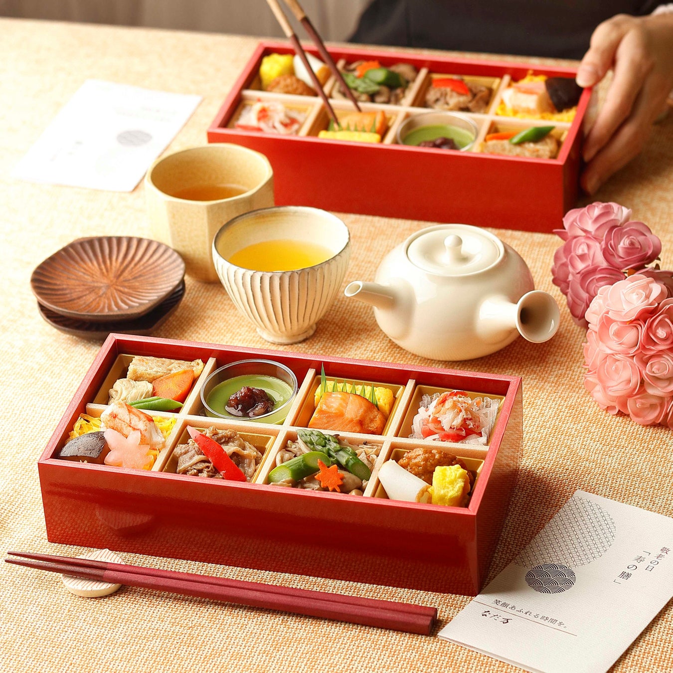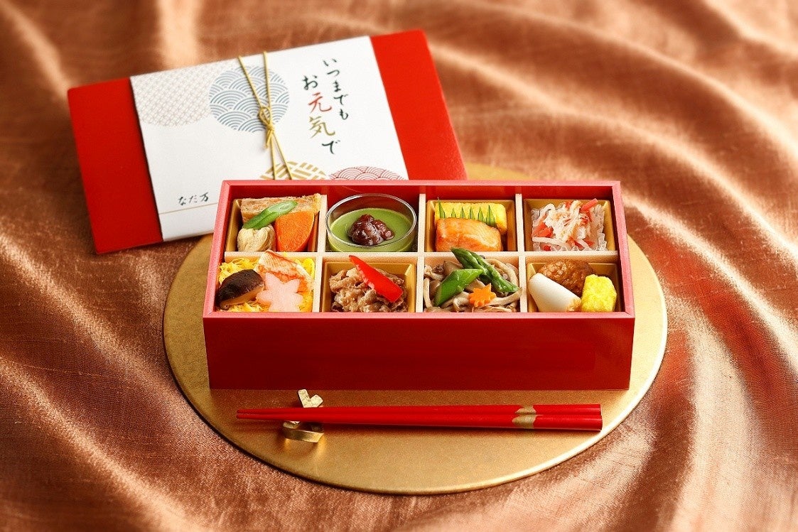 品の良い光沢のある朱色の折箱に、なだ万こだわりのタレで煮込んだ「牛すき焼」、上品な味わいの「鮭(さけ)柚(ゆ)香焼(こうやき)(サーモントラウト)」、お祝いの御席に彩りを添える「紅白祝いなます」、そして食後のやさしい甘さ「抹茶プリン」など多彩な味わいを少しずつお楽しみいただけます。