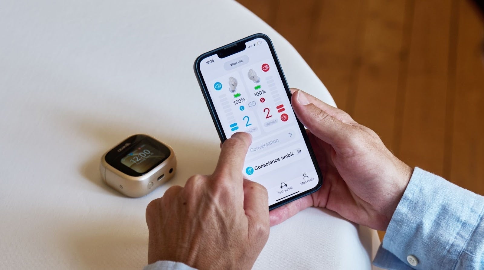 先進的なAI音声処理技術と、直感的に操作できるタッチスクリーン搭載の充電ケースを融合したWaveは、専門性の高い音声処理性能と、日常生活における使いやすさの両立を実現しました。これにより、聞こえに不安を抱える方々へ、より快適で自然なコミュニケーション体験を提供します。