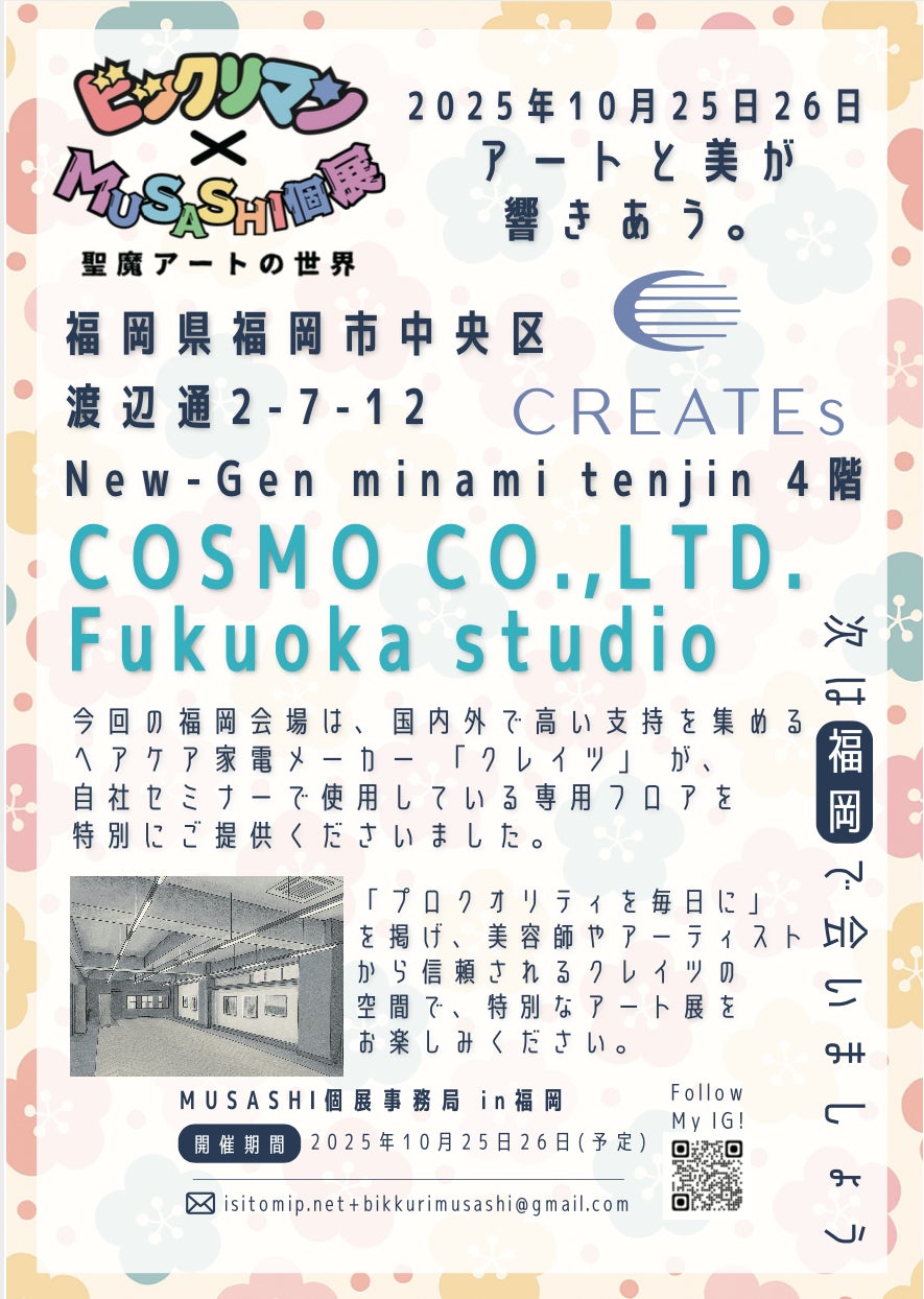今回の福岡会場は、国内外で高い支持を集めるヘアケア家電メーカー「クレイツ」に、自社セミナーで使用している専用フロアを特別にご提供いただいた。「プロクオリティを毎日に」を掲げ、美容師やアーティストから信頼されるクレイツの空間で開催される、特別なアート展をぜひお楽しみに。
