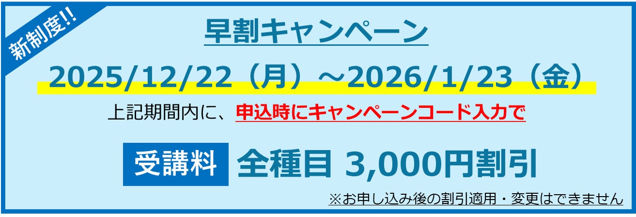 2026年1月23日(金)までに受検講習会へお申し込みいただくと、受講料が割引になる「早割キャンペーン」を実施します!