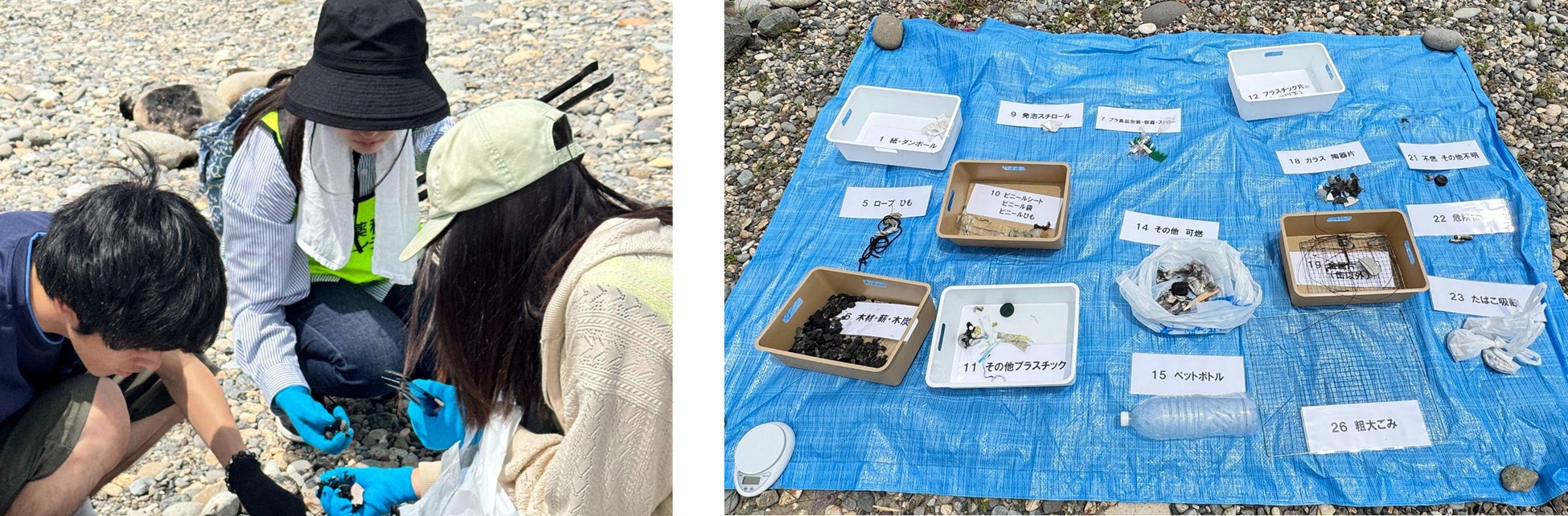 河川ごみ発生抑制に取り組むことを目的とし、長良川流域(美濃市)を対象に、大学生を中心とした調査員が、指定の調査区画においてごみ拾いを実施し、拾ったごみの種類と数を記録する河川ごみ分布調査。