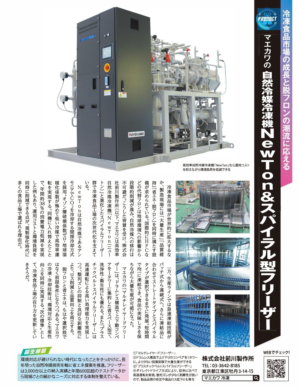 世界シェア 40%以上を誇る産業用冷凍機をはじめ、各種産業機械の製造・販売ならびにプラントの設計・施工を手がける株式会社前川製作所(本社:東京都江東区、代表取締役 社長執行役員:前川 真、以下 「当社」)は、高効率自然冷媒冷凍機「NewTon」ならびに「スパイラル型フリーザー」シリーズを、2026年3月4日(水)発売の「日経トレンディ」に広告掲載しました。