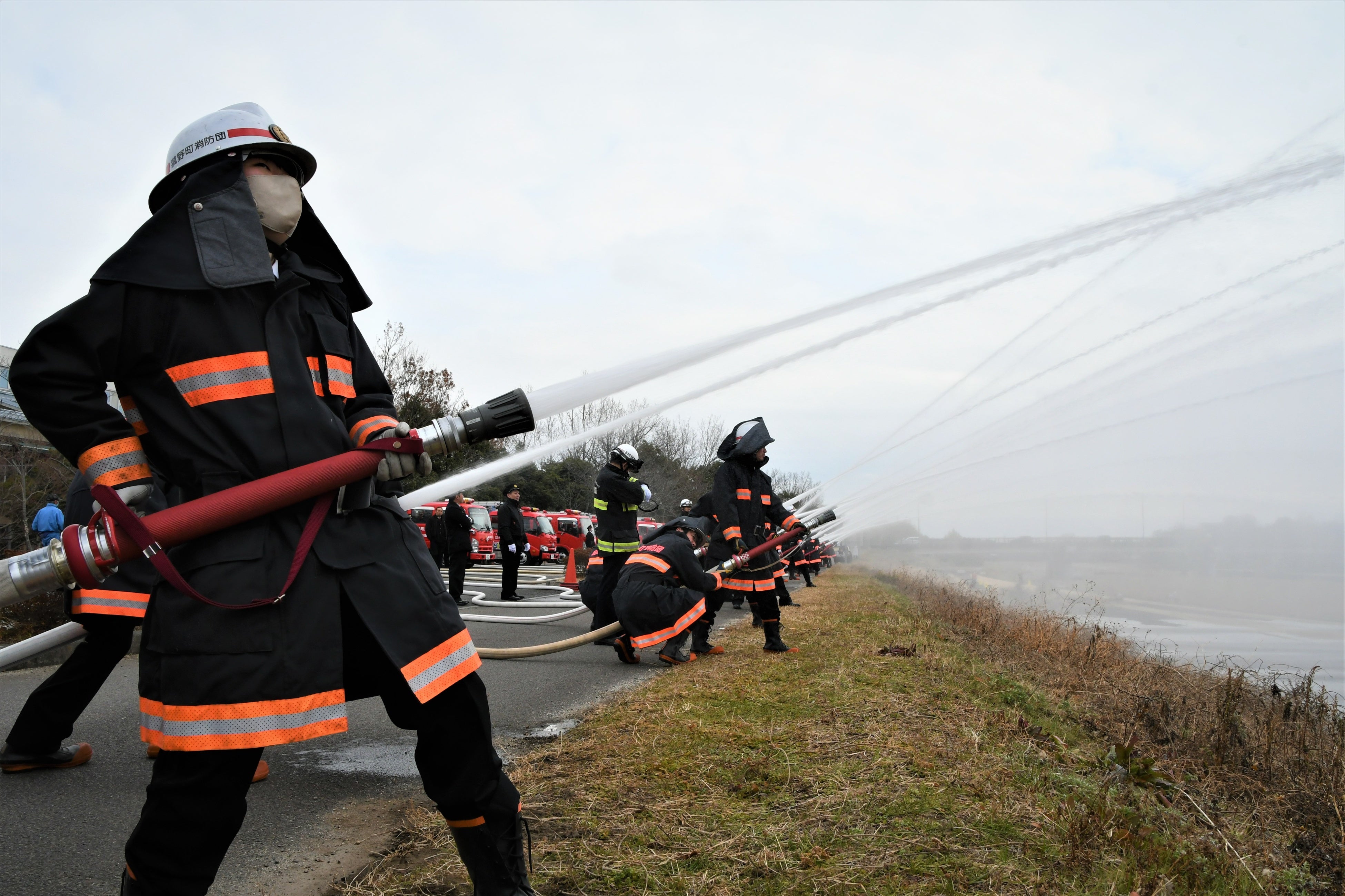当日は入場パレードを皮切りに、優良消防団員の表彰や通常点検、消防訓練展示といった伝統的な催しに加え、消防団員による一斉放水も実施します。