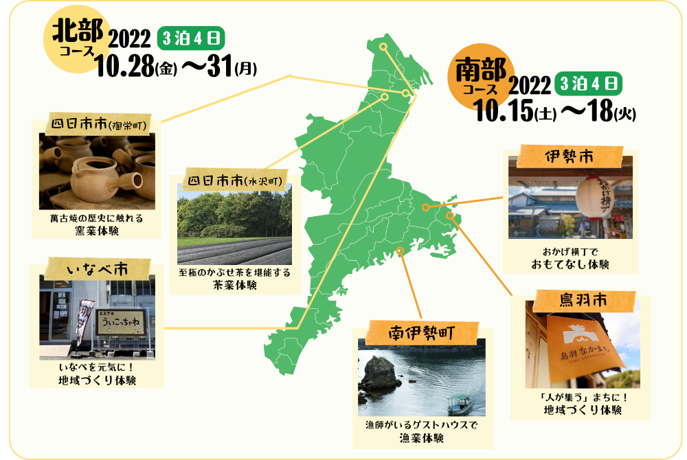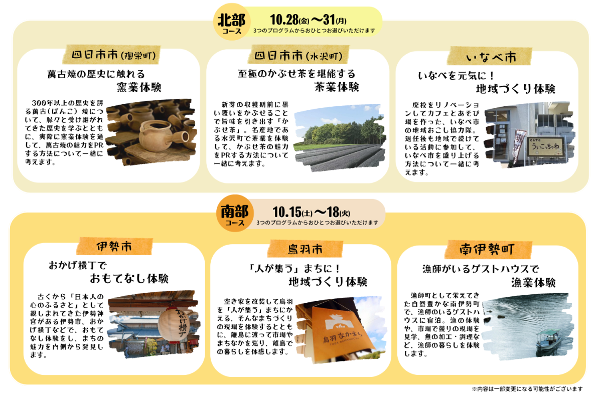 県内の北部と南部でそれぞれ3つ、計6つの地域において、地域づくりや農業・漁業・窯業・観光業など、三重県ならではの「しごと」体験と、そこで暮らしている先輩移住者や地域の方々とつながり、交流できる3泊4日のプログラムです。
