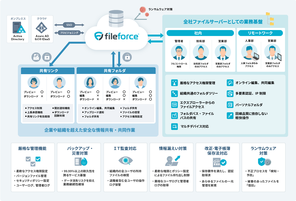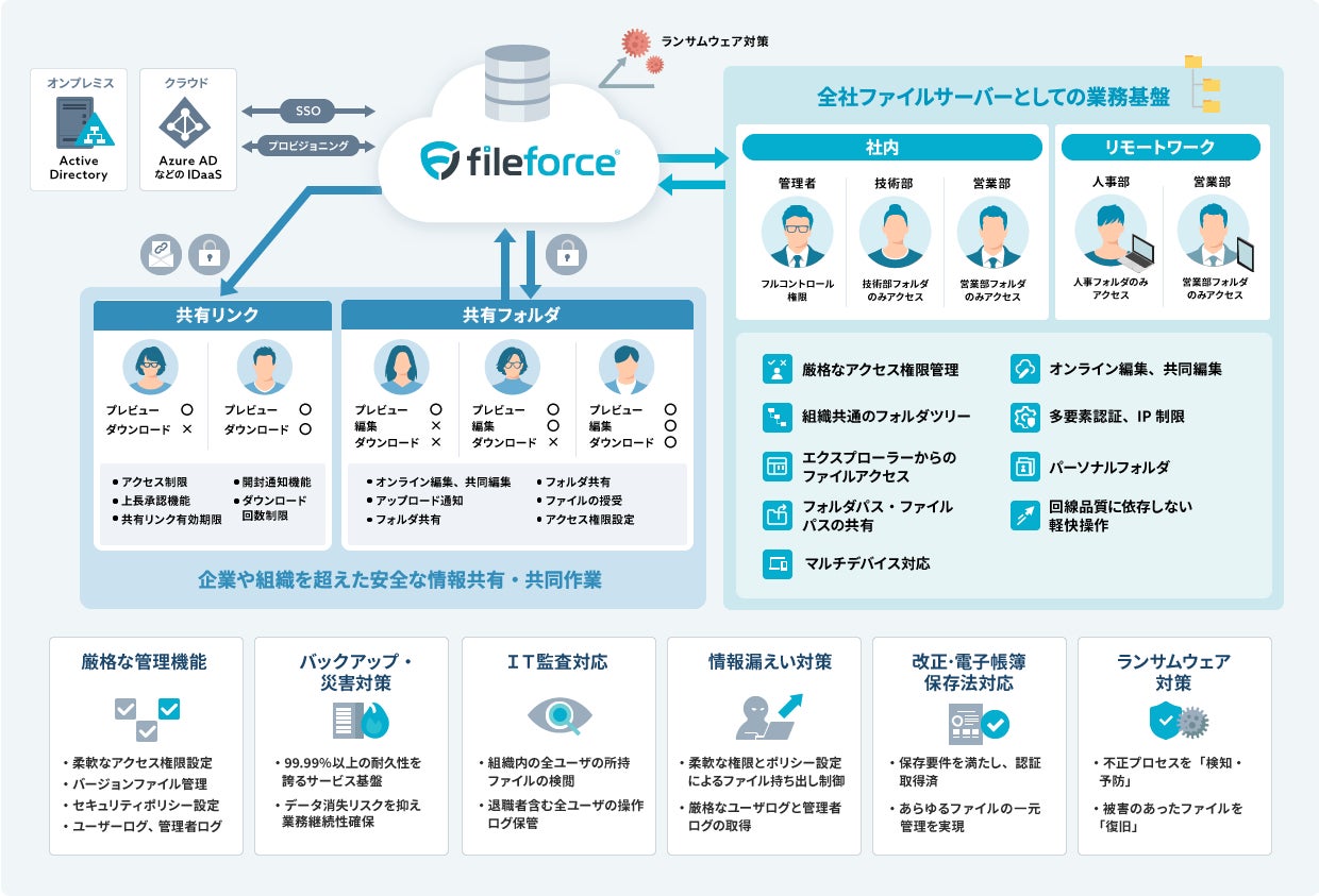 国産クラウドストレージFileforceは、国内の中小・中堅企業からエンタープライズまで利用社数20,000社(OEMパートナ等を含む)を突破。従来のオンプレミスのファイルサーバやNASの使いやすさ、アクセス権限などの運用を変えずに、安全なファイル編集やファイル共有機能をユーザ数無制限で提供する、コストパフォーマンスに優れたストレージSaaSです。