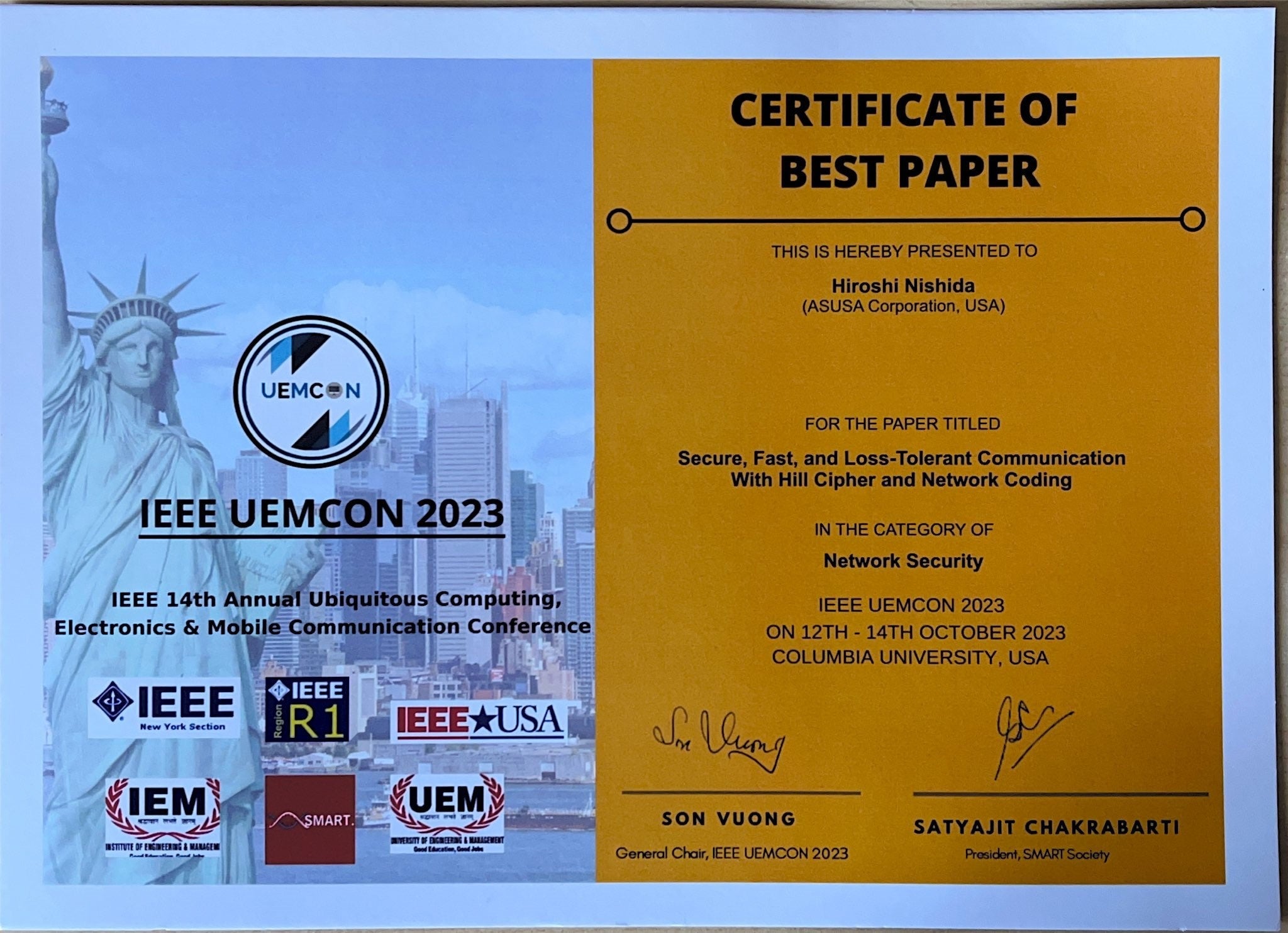 2023年10月12日から10月14日に、アメリカ・ニューヨークで開催された、2023 IEEE (*1) 14th Annual Ubiquitous Computing, Electronics & Mobile Communication Conference (UEMCON)において、ASUSA Corporation のCOOである理学博士西田博史が公表した論文、「Secure, Fast, and Loss-Tolerant Communication with Hill Cipher and Network Coding」(以下、「HNC」)が、Algorthms and Theory(アルゴリズム部門)及びNetwork Security(ネットワークセキュリティ部門)の2部門において、最優秀論文賞(Best Paper Award)を受賞いたしました。