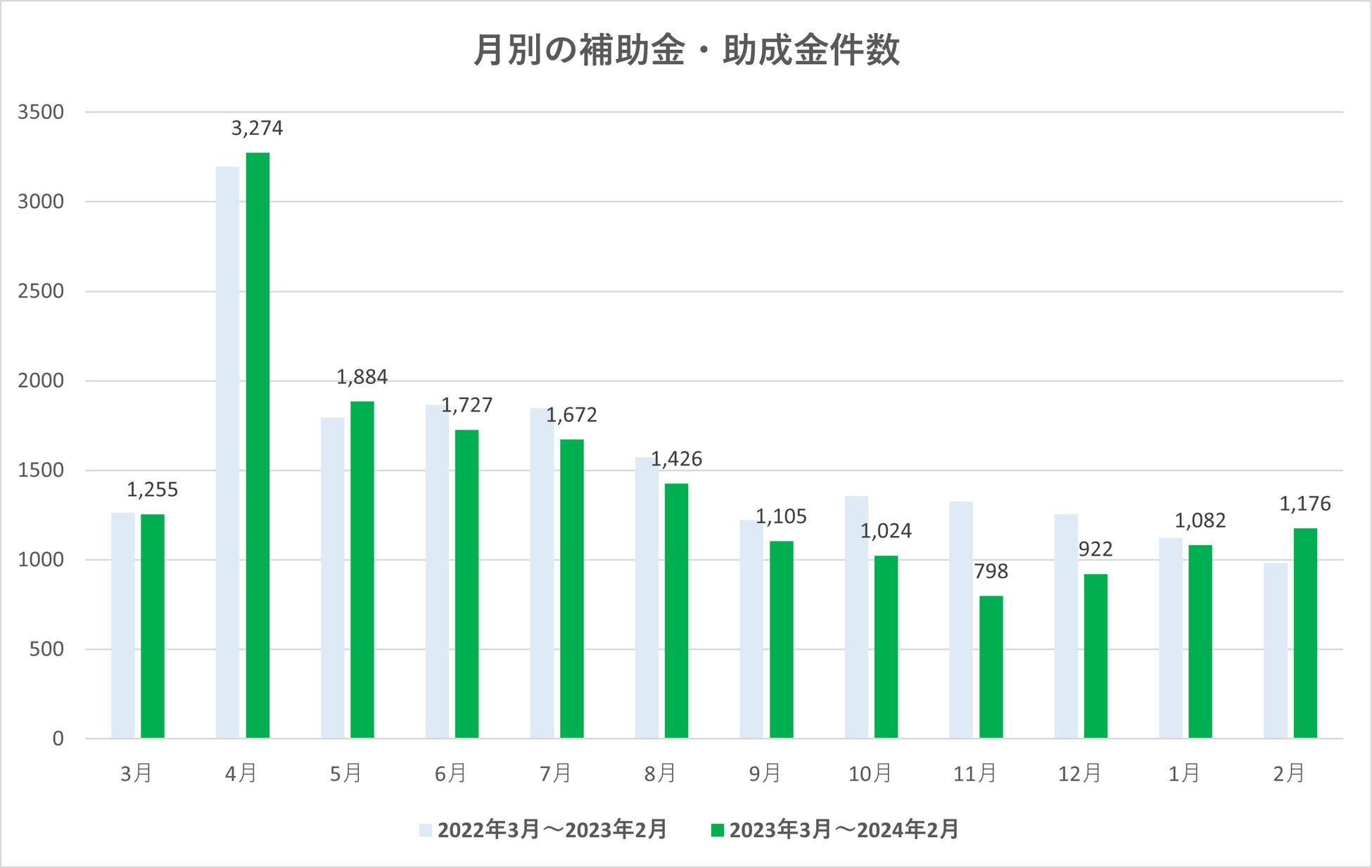 各機関から登録した補助金・助成金情報の件数を、月別に集計して直近2年間分をグラフ化したものです。