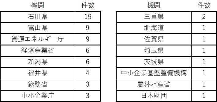 能登半島地震が2024年1月に発生したので、それに対する補助金情報を調査するため、2024年1月、2月の補助金情報を対象にして、件名に「地震」「災害」を含む情報数を機関別にカウントして以下の表にまとめました。被災地である石川県、富山県の件数が多くなっていることがわかります。資源エネルギー庁も件数が多くなっていますが、こちらは「災害」に関連した補助金ではあるものの、能登半島地震に直接関係がある補助金ではありませんでした。